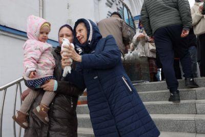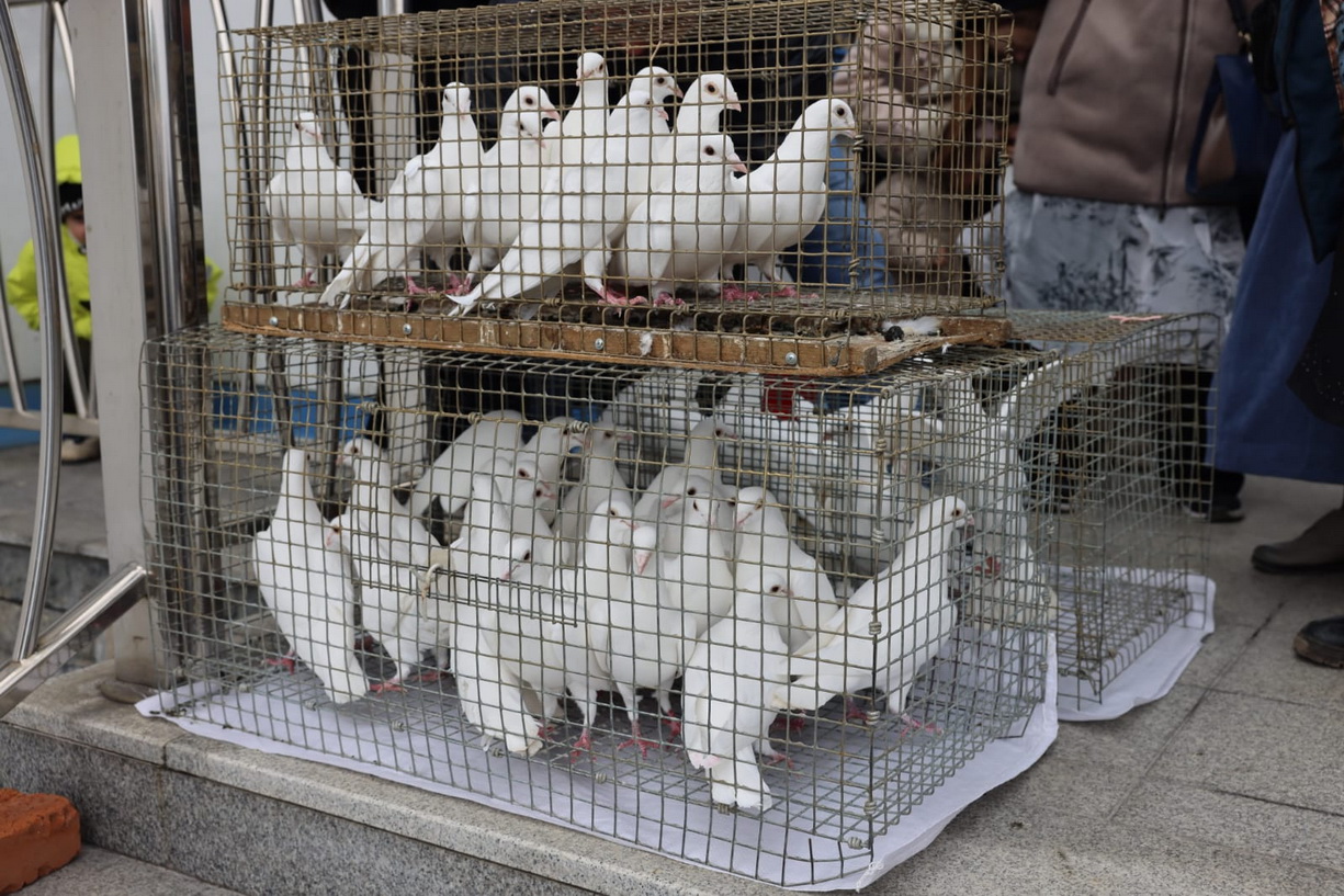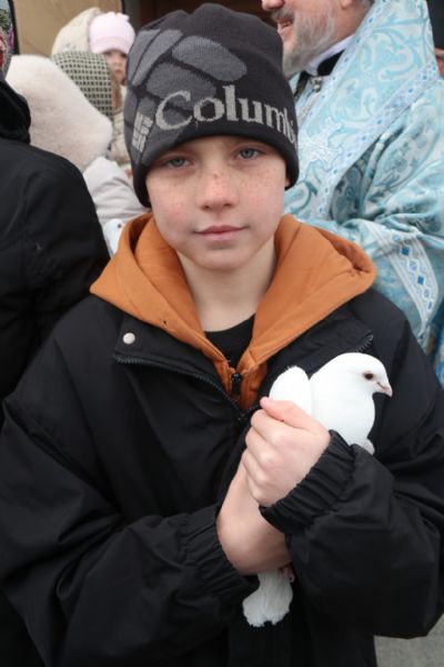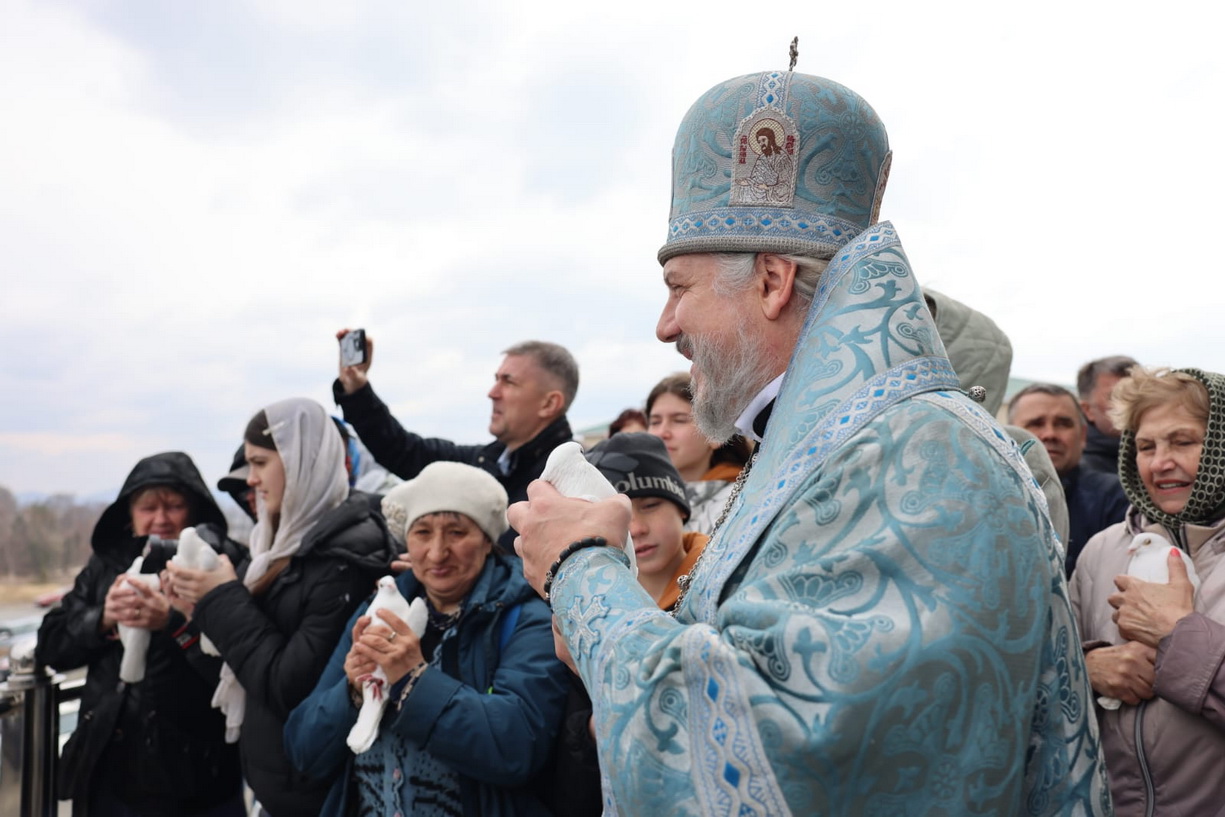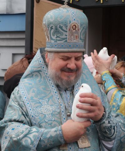 По окончании богослужения Преосвященный Николай, с паперти верхнего храма, выпустил в небо над Кафедральным собором белых голубей.