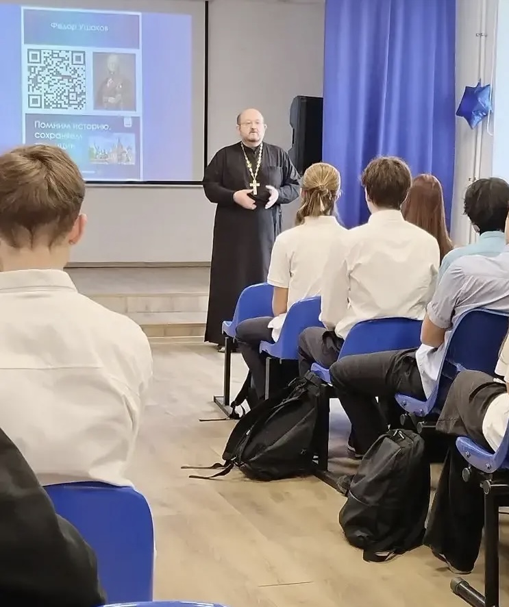 Руководитель Епархиального отдела Религиозного образования и катехизации Находкинской Епархии иерей Роман Капитанюк посетил СОШ № 5 г. Находки, где провел два урока с учащимися 10 классов, 8 "А" и 7 "А" классов. Обсуждали нравственные вопрос, начиная с самого понятия нравственности и морали; что человека делает человеком, что способствует достижению целей в жизни; какими качествами должен обладать человек, чтобы жить, развиваться, быть достойным мужем или женой, отцом или матерью в будущем, достойным другом, сыном или дочерью, достойным гражданином своей страны. Что является фундаментом человеческих отношений, что лежит в основе культуры народов мира. Разобрать столь важные и сложные темы нам помогли жизнеописания наших великих соотечественников: Федора Ушакова, Александра Суворова, святителя Луки Войно-Ясенецкого.