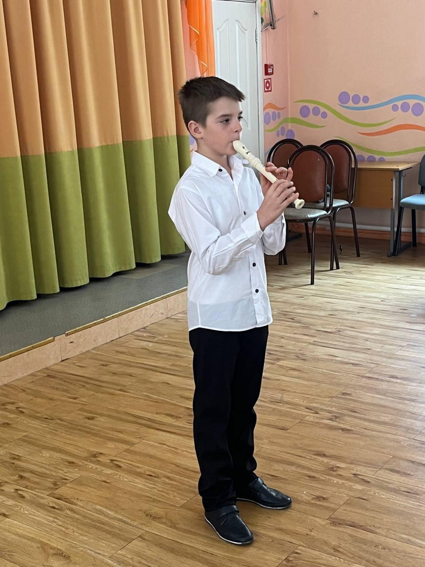 Самый маленький участник концерта, Ридченко Иван, исполнил на блокфлейте песенку В. Шаинского "В траве сидел кузнечик".