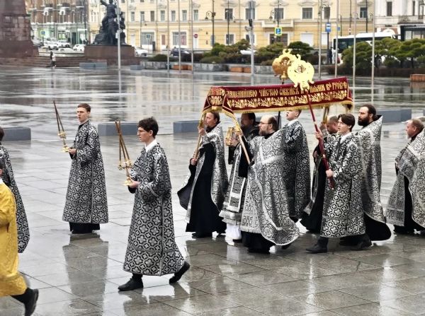 После Великого славословия перед плащаницей, под пение «Святый Боже» священнослужители подняли плащаницу и во главе с владыкой прошествовали вокруг храма. Сонм духовенства, клира и мирян совершил крестный ход с плащаницей, который символизирует погребение Христа и позволяет всем верующим стать соучастниками этого трагического, но спасительного события.