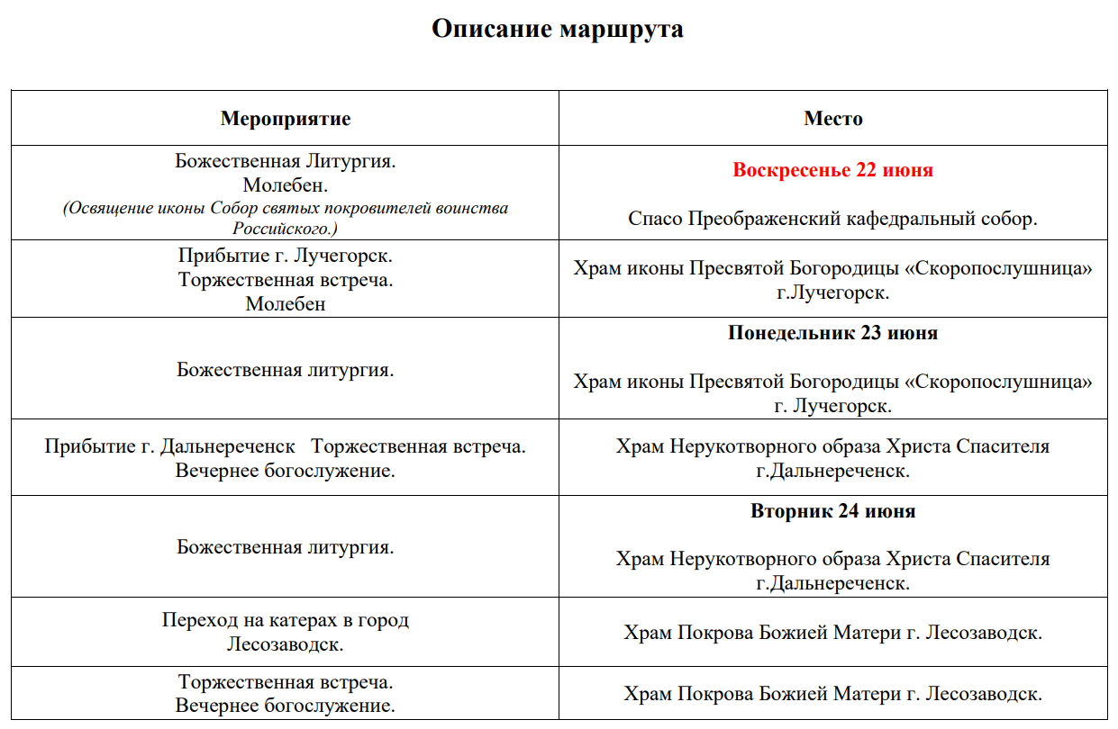 По планам торжественное освящение иконы состоится 22 июня в Спасо- Преображенском кафедральном соборе города Владивостока. Далее икона отправится до Лучегорска и дальше по многим городам и весям Приморской земли. В каждом населенном пункте будут совершаться Богослужения, а в промежутках между службами икона будет посещать воинские подразделения, где вместе с воинами будет возможность помолиться о крепости нашего воинства перед образами святых, покровителях нашего воинства. (см. Таблица 2 «Описание маршрута»).