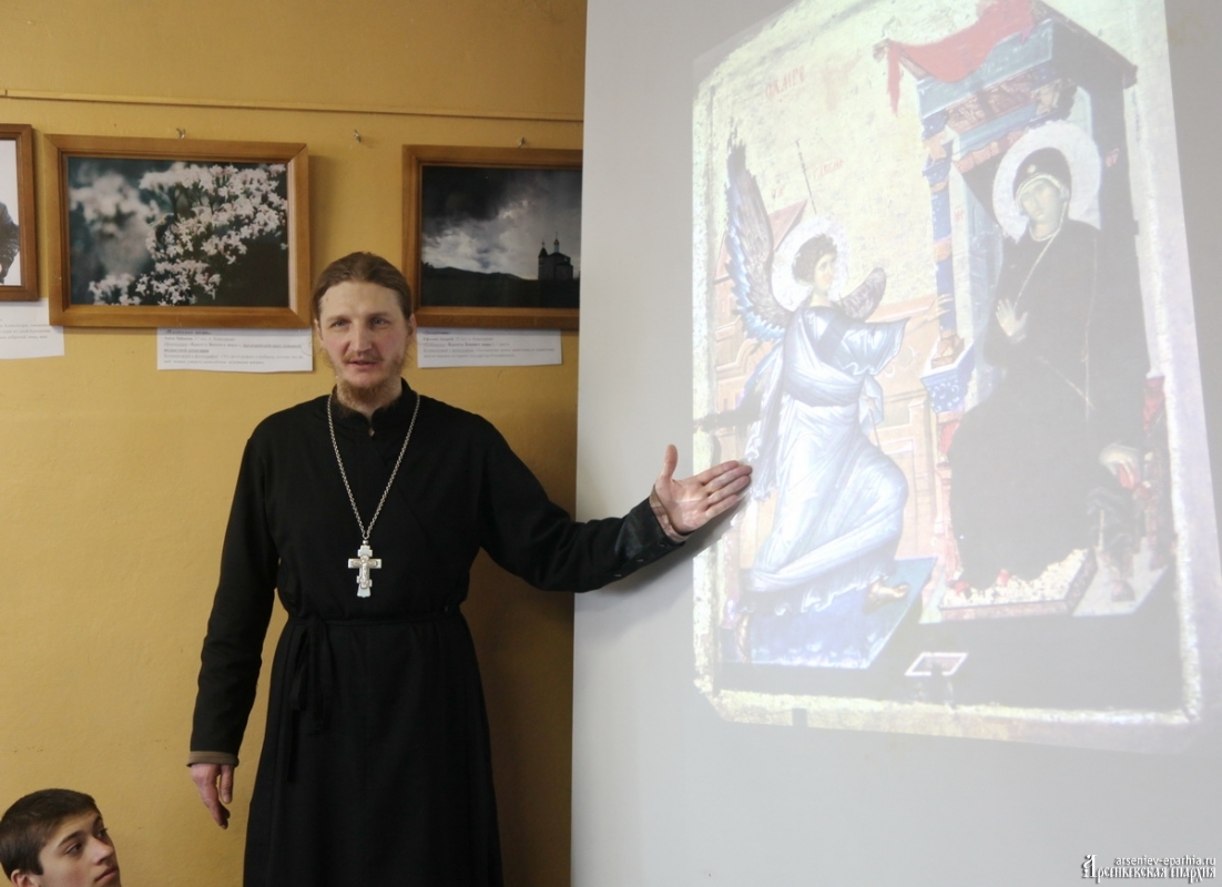 Так, утром 14 февраля к ребятам приехал клирик епархии иерей Димитрий Селивановский. О. Димитрий рассказал, кто такие пророки, святители, праотцы и преподобные, а также объяснил значение важнейших, двунадесятых церковных праздников. На слайдах священник показал ребятам шедевры древнерусской иконописи.