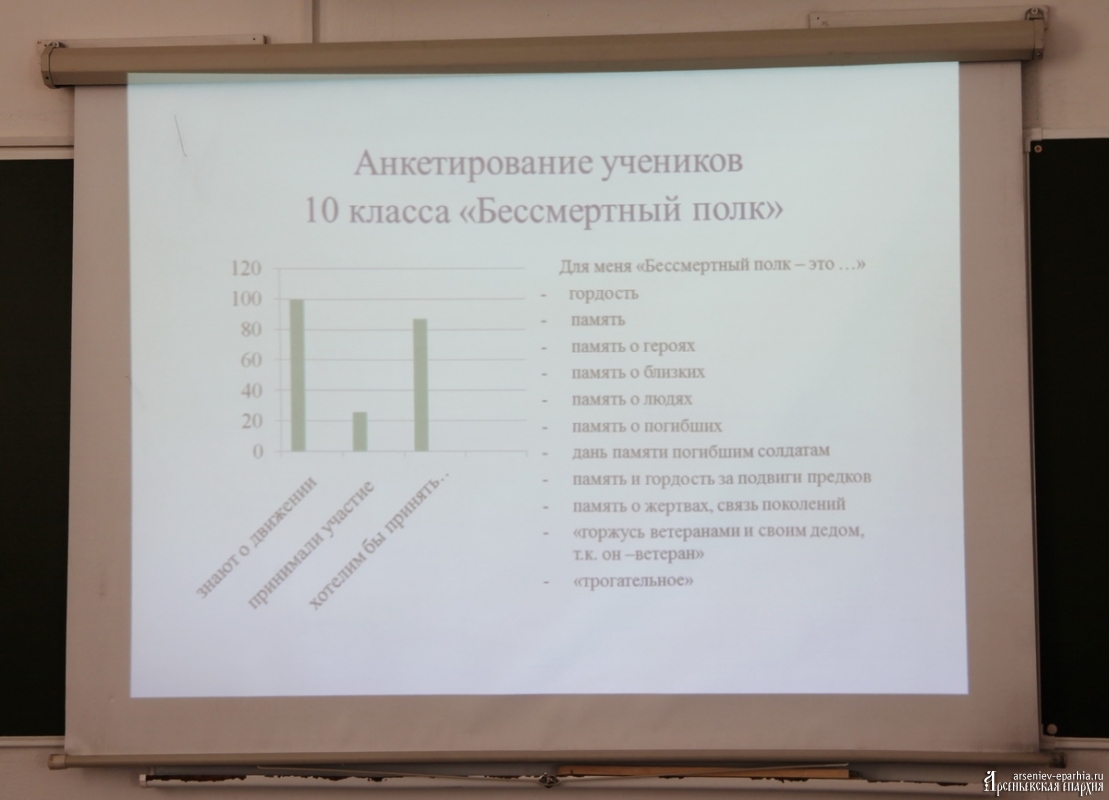 Чтобы объяснить детям, что такое” Бессмертный полк”, мы с учителем истории Любовью Михайловной Тихоновой придумали целое школьное движение под названием “Победный марш”, которое продолжается целый год, с октября по май. Это движение включает в себя тест по истории, сценки, плакаты и большое заседание, на котором и взрослые, и учителя, и дети рассказывают о Героях войны и о том, что они думают о войне”.