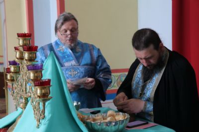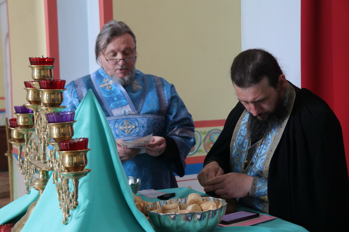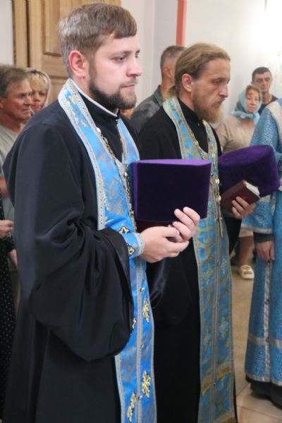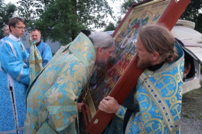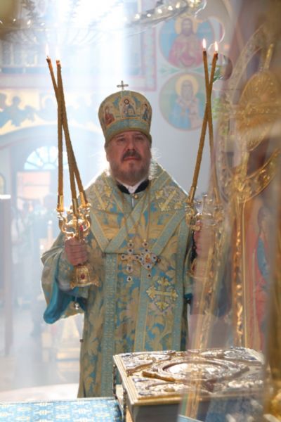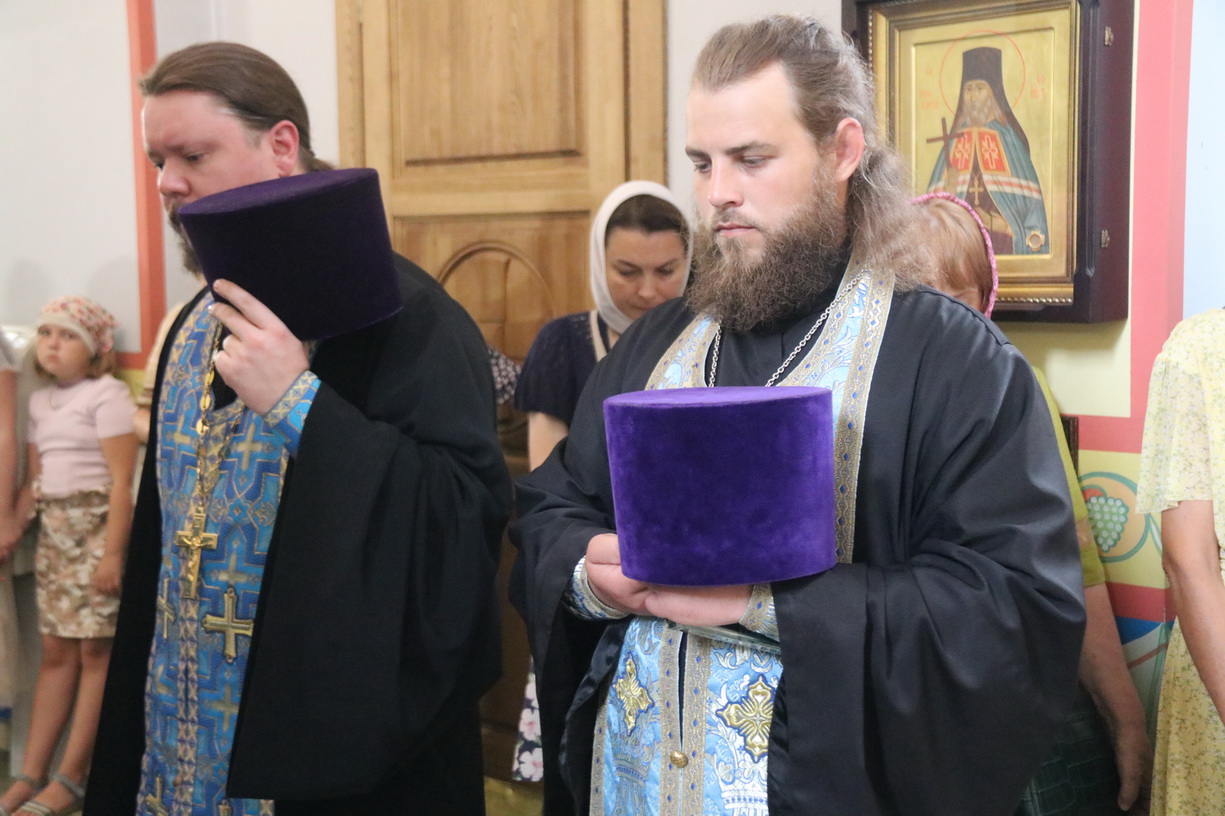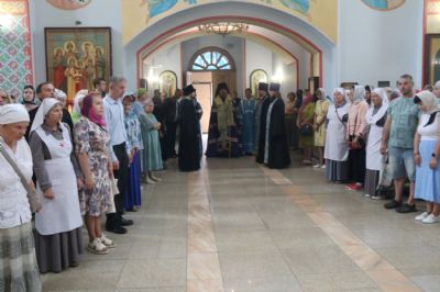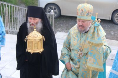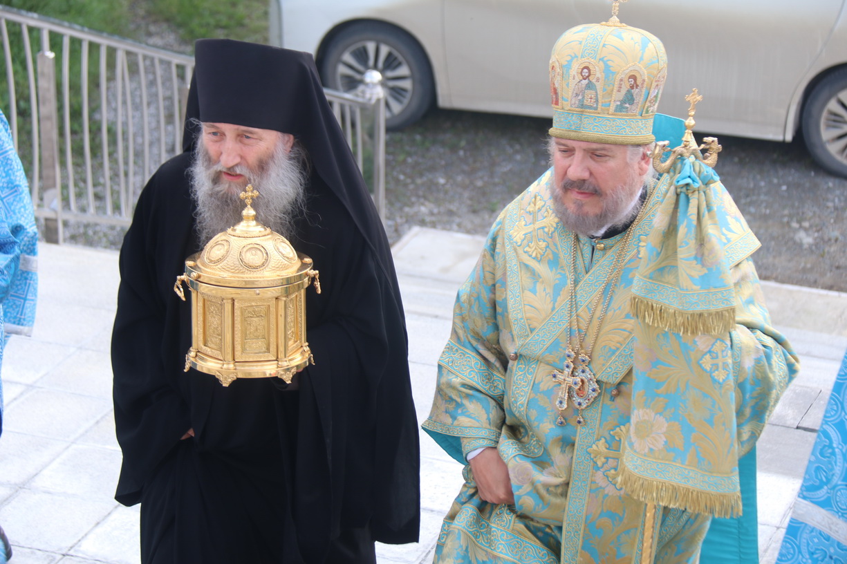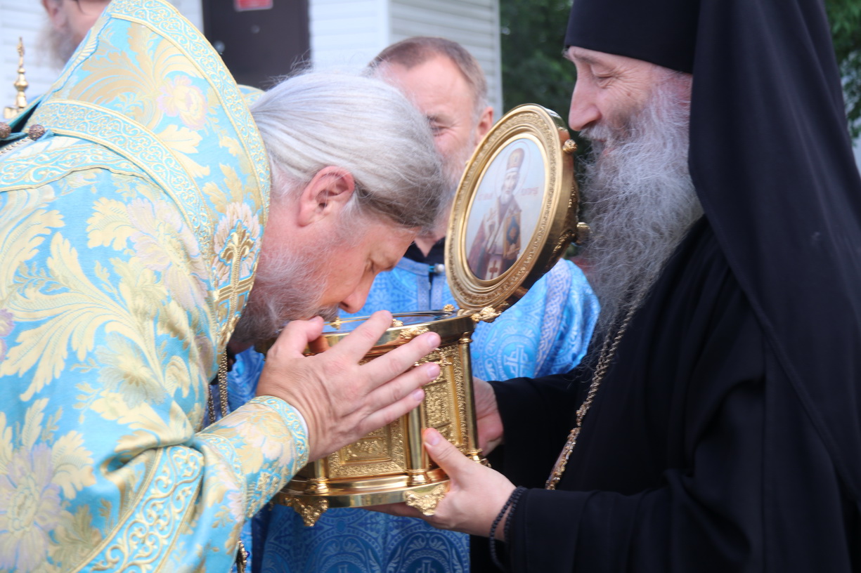 На паперти храма, икону и чудотворные мощи втретили епископ Николай, духовенство храма и многочисленные прихожане.