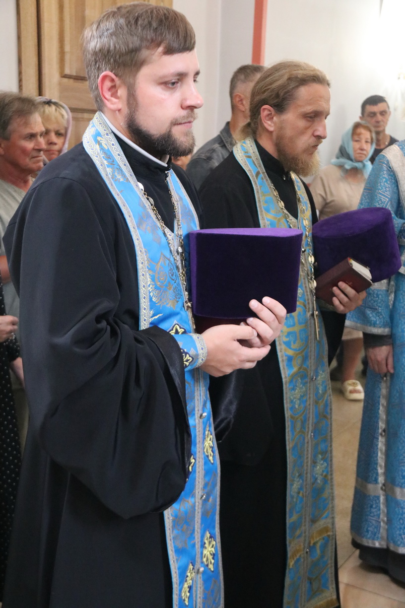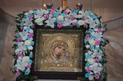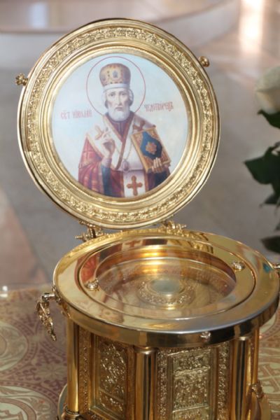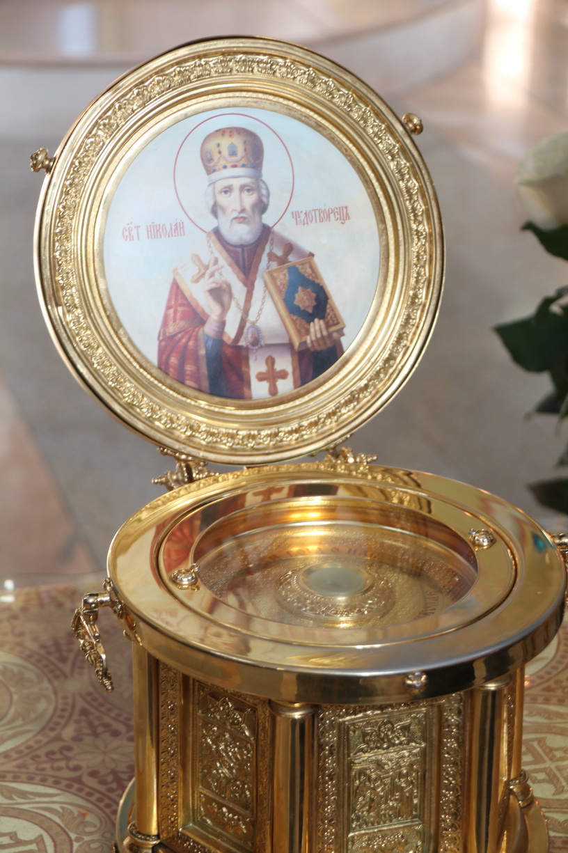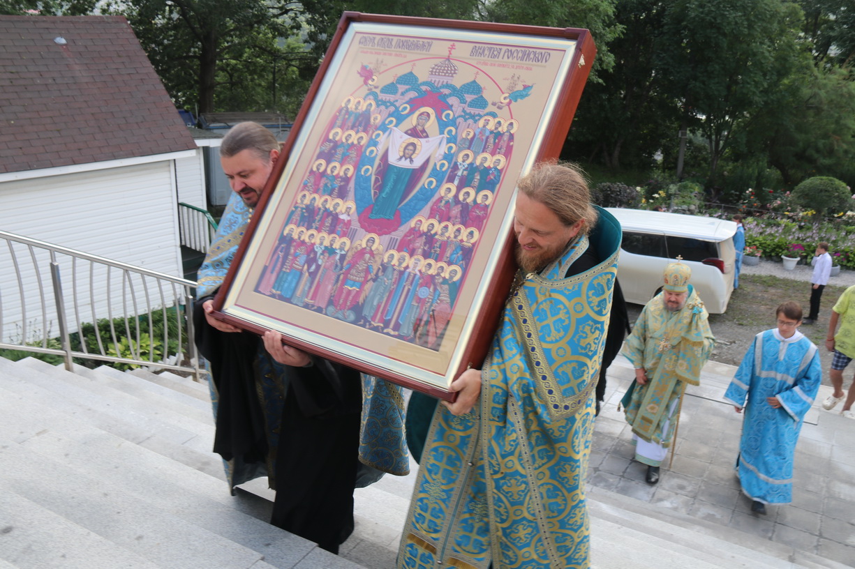 По завершении праздничного полиелея, перед началом помазания, епископом Арсеньевским и Дальнегорским Гурием, в Казанский Кафедральный собор, была доставлена Икона "Собор святых покровителей воинства российского" и ковчег с мощями святителя Николая Чудотворца.
