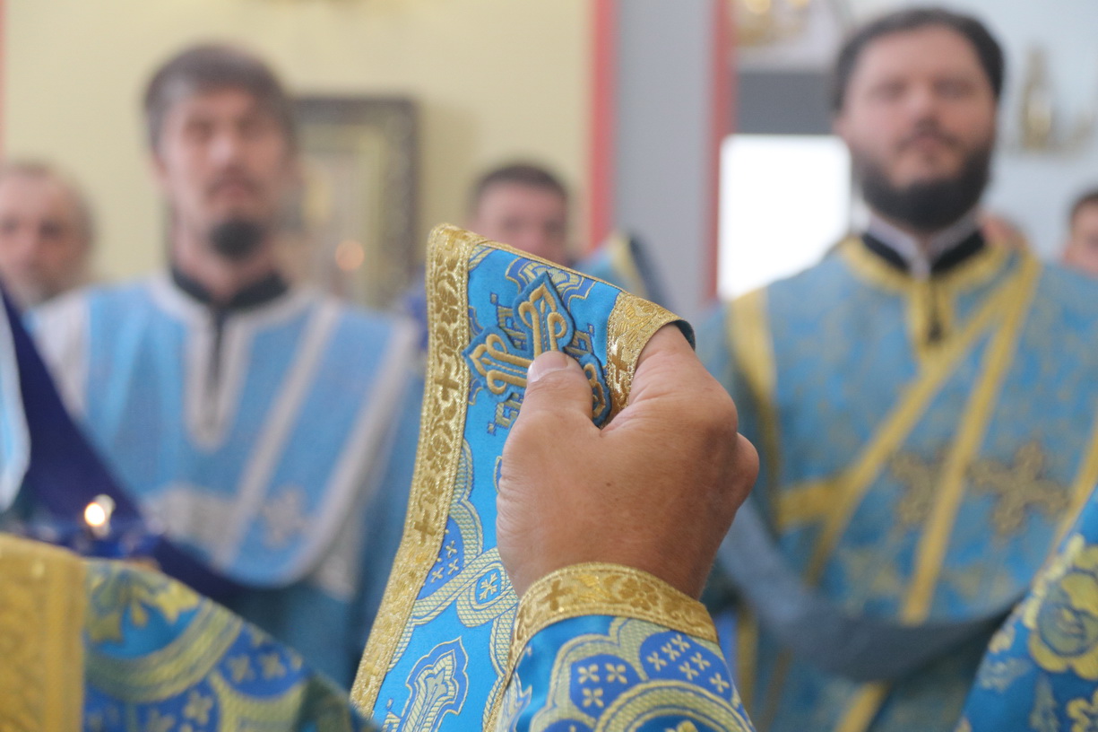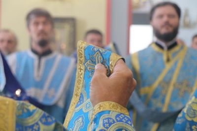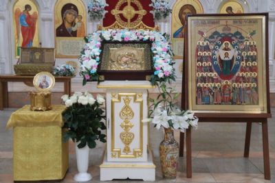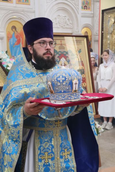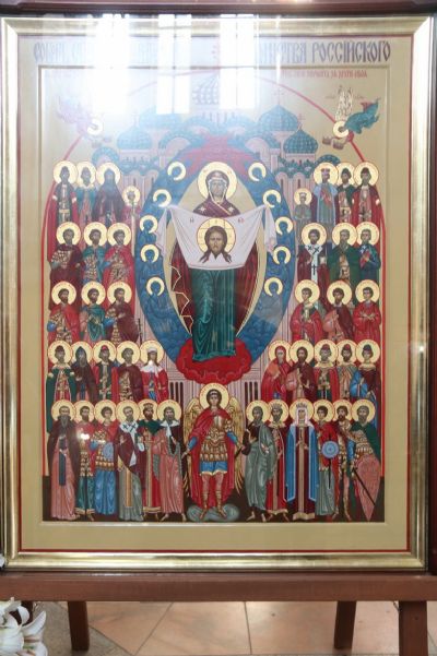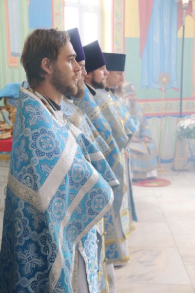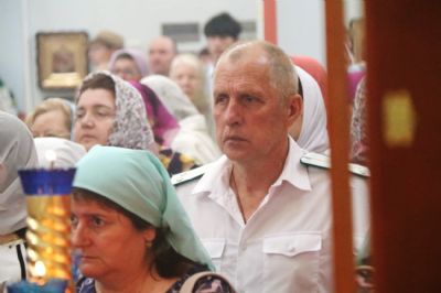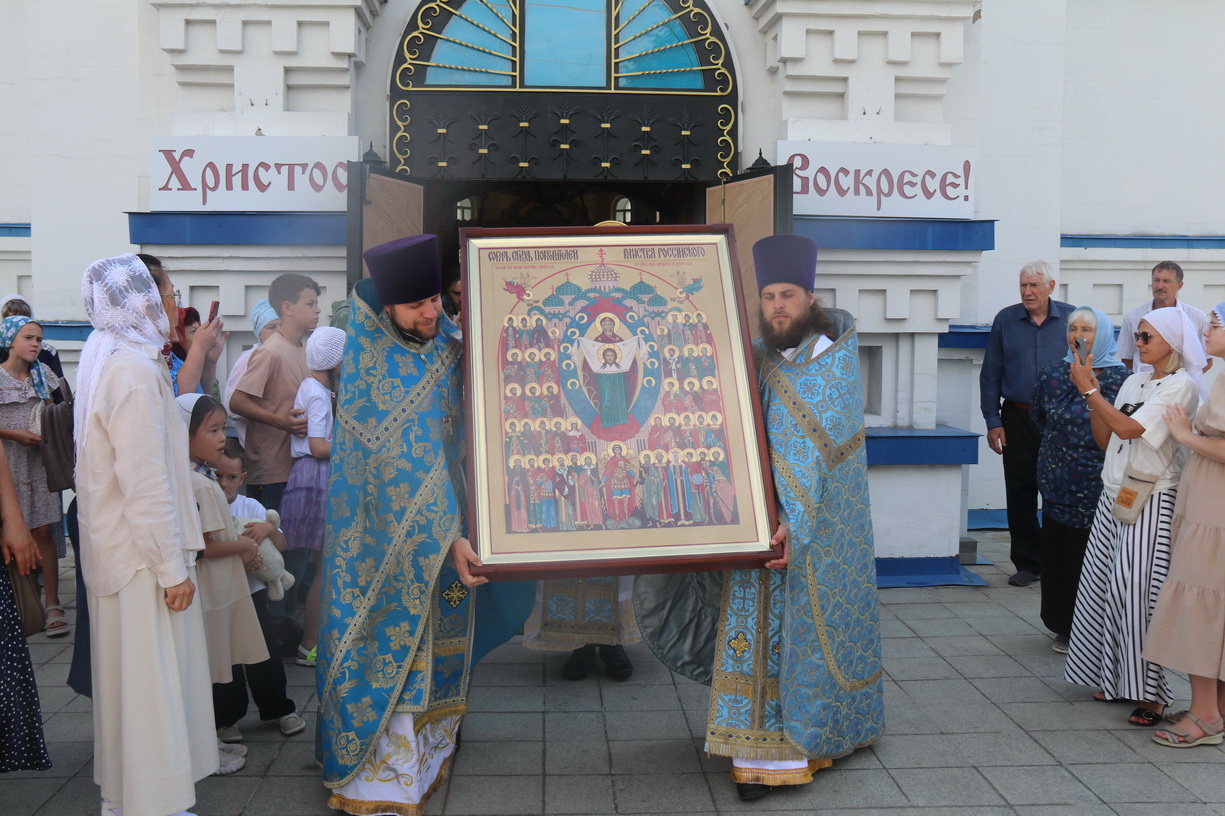 Литургия совершалась перед иконой «Собор святых покровителей воинства российского», прибывшей в храм накануне Крестным ходом из Арсеньевской епархии.