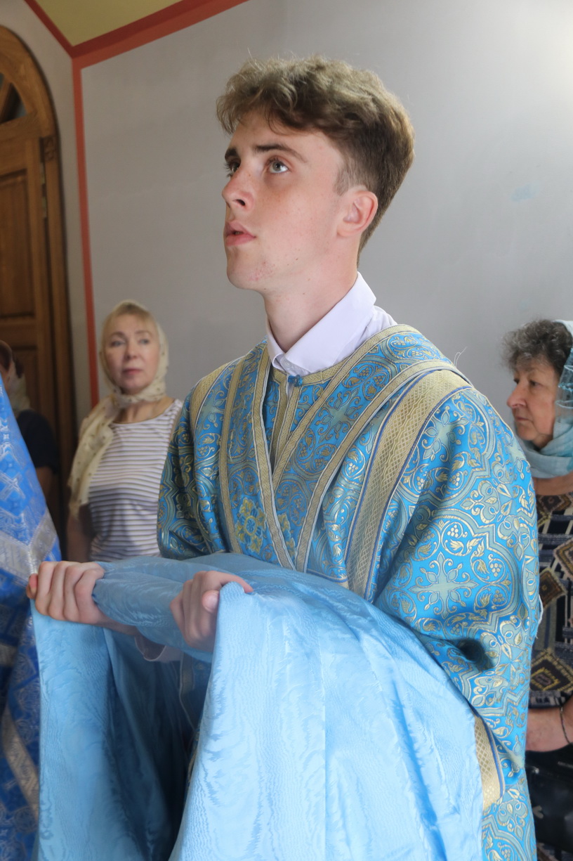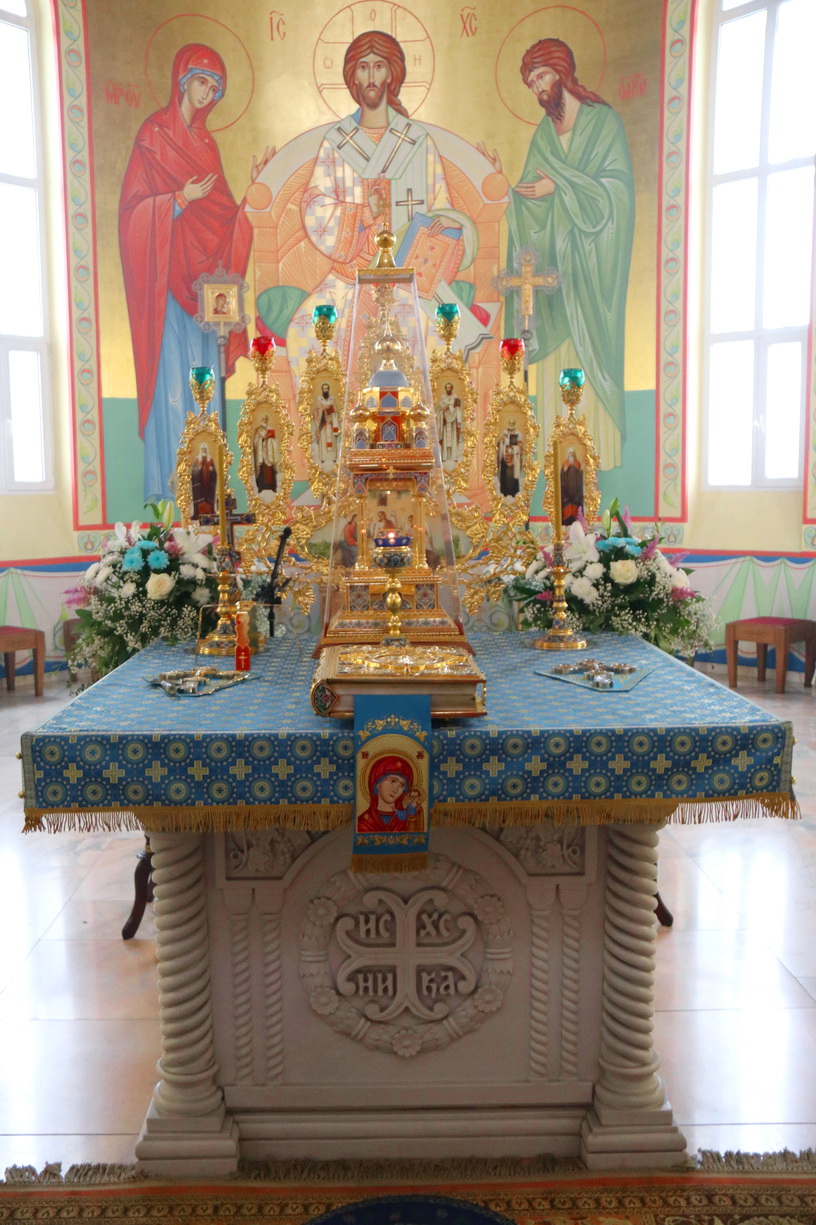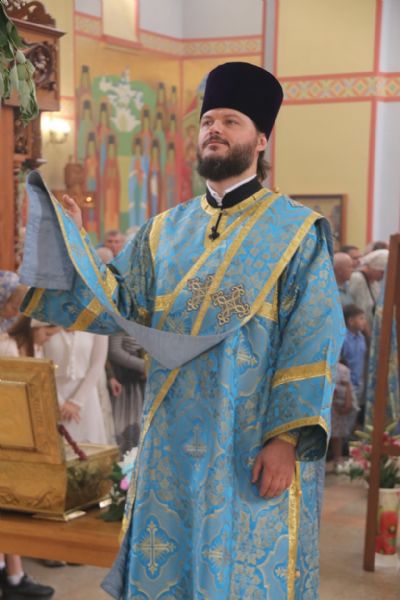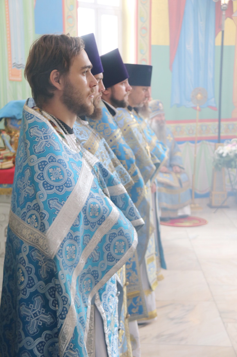 Литургия совершалась перед иконой «Собор святых покровителей воинства российского», прибывшей в храм накануне Крестным ходом из Арсеньевской епархии.