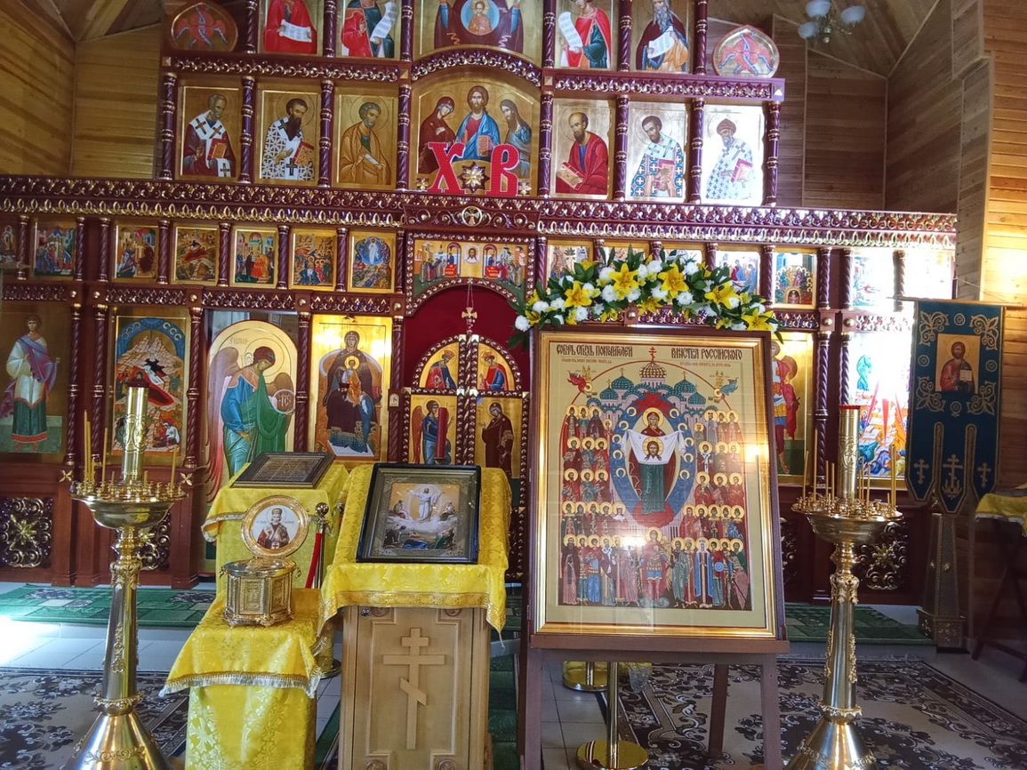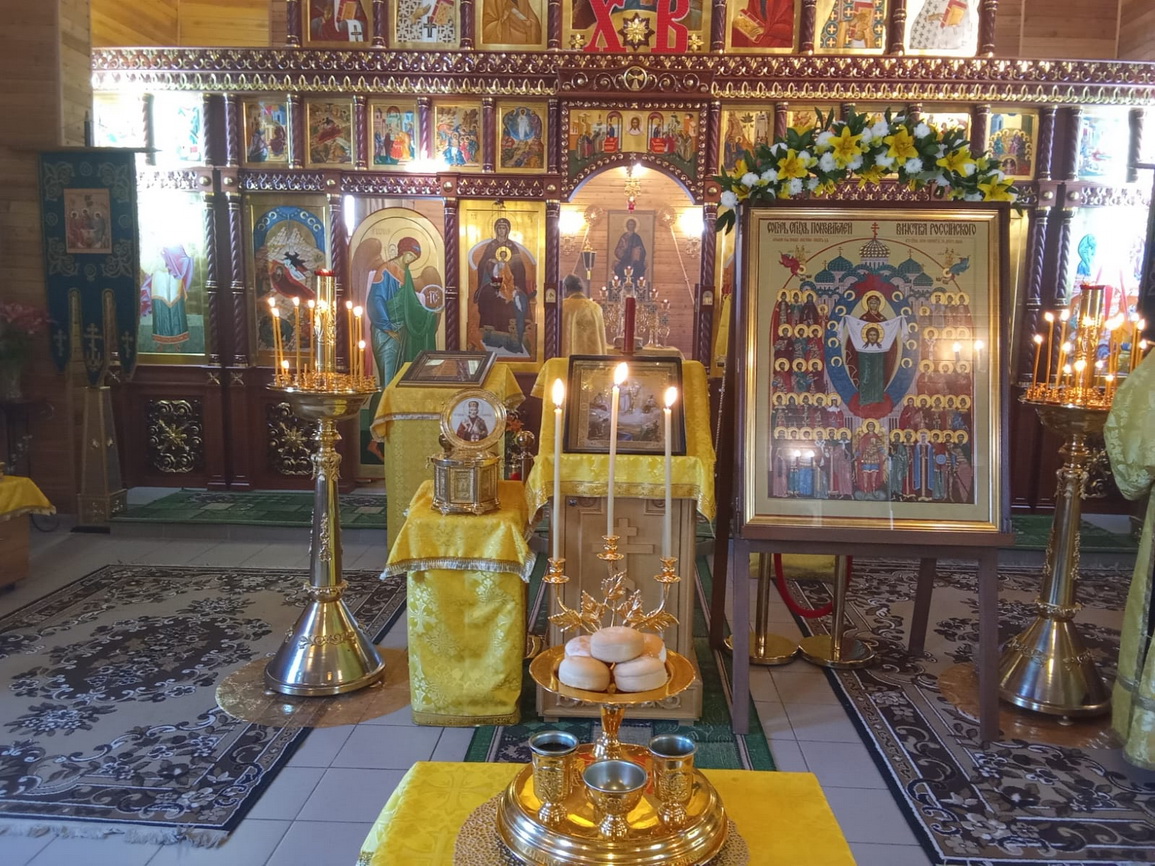 После этого чтимая икона "Собор святых покровителей воинства российского» и мощи святителя Николая Чудотворца отправились в храм прп.Серафима Саровского с. Лазо, где состоялся молебен перед иконой «Святых покровителей воинства российского» и ковчегом с мощами святителя Николая Чудотворца.