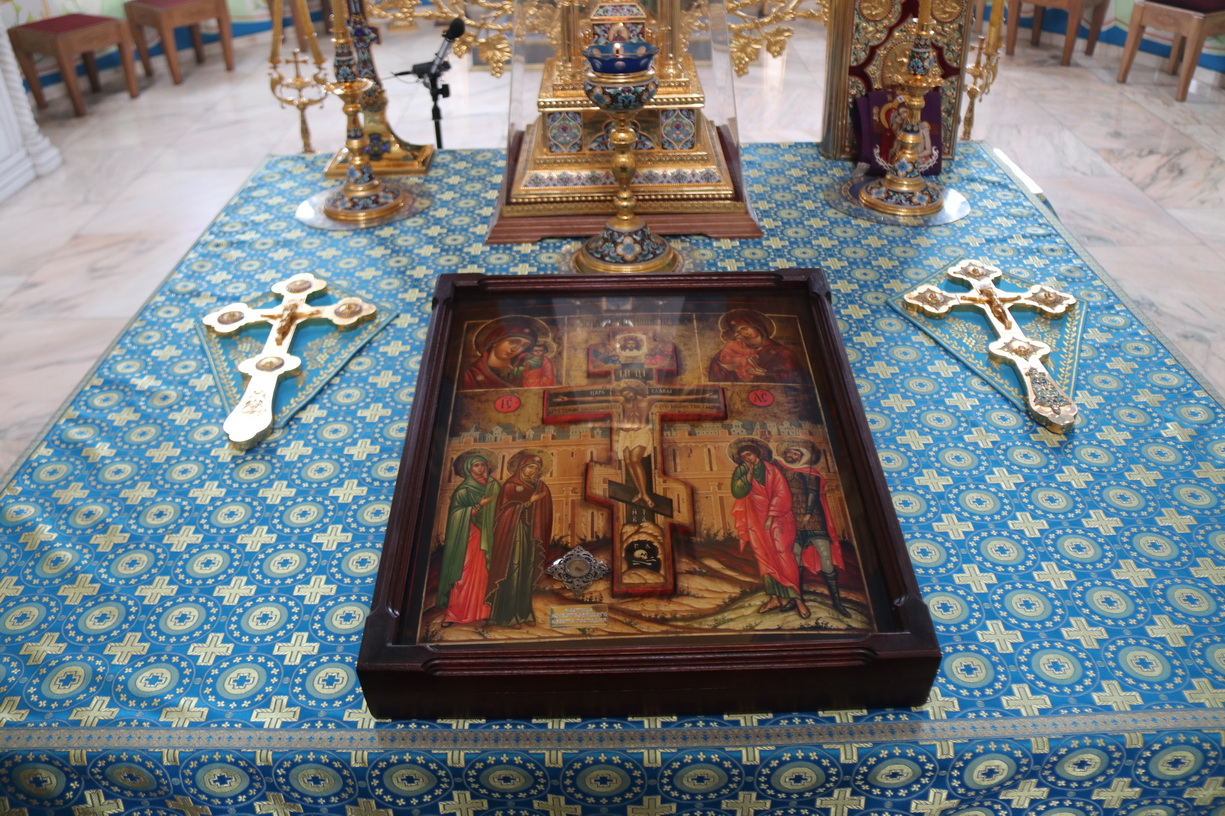 После великого славословия епископ Николай совершил вынос из алтаря храма иконы с частицей Честного Креста Господня.