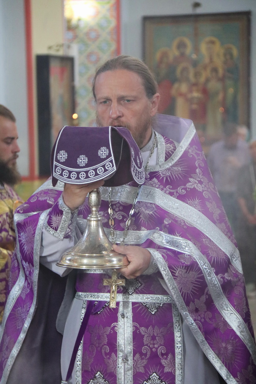 Согласно церковному уставу, накануне вечером на великом славословии икона с частицей Животворящего Креста Господня торжественно была вынесена из алтаря собора для поклонения верующим.