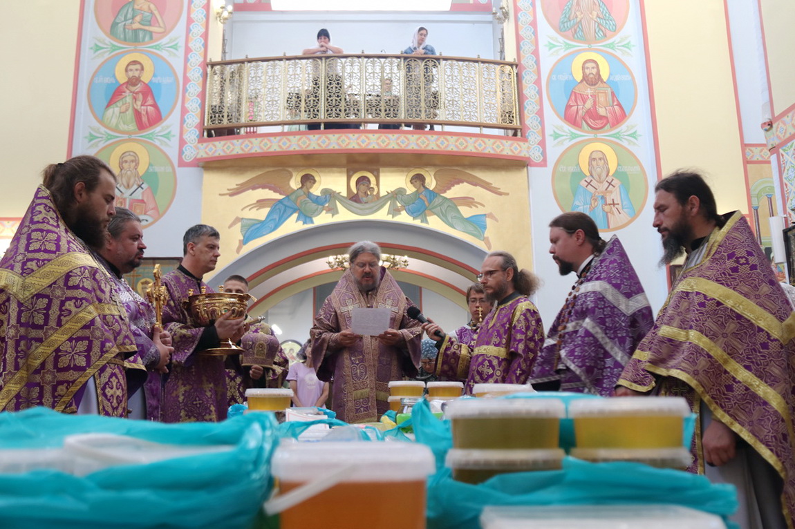 По заамвонной молитве епископ Николай совершил традиционное для этого дня освящение меда нового сбора, после чего окропил всех присутствующих святой водой.