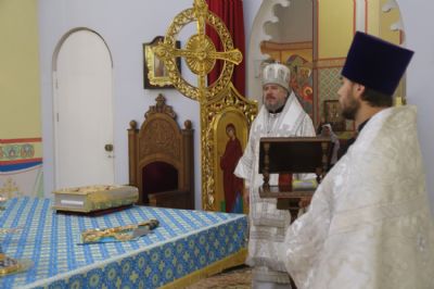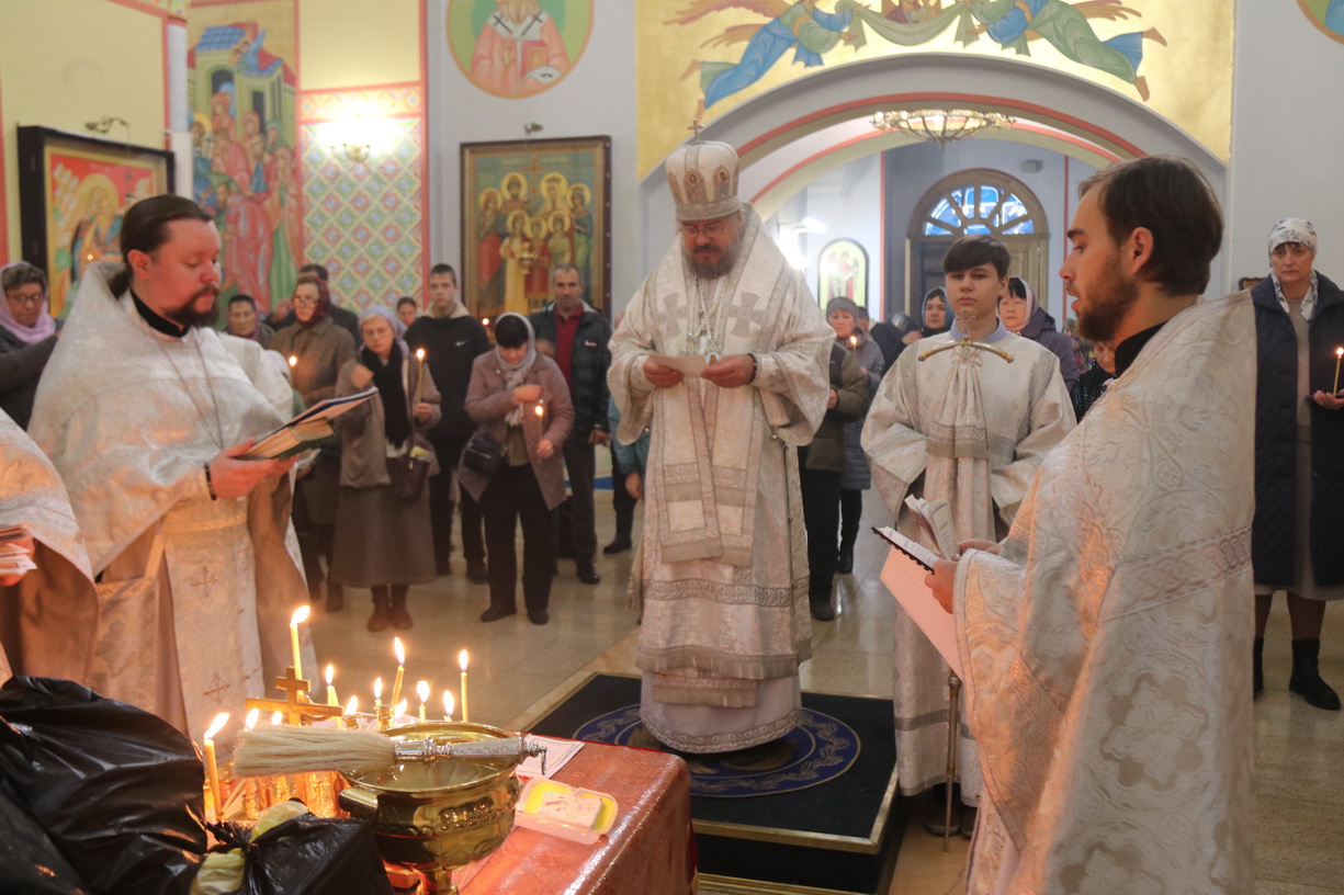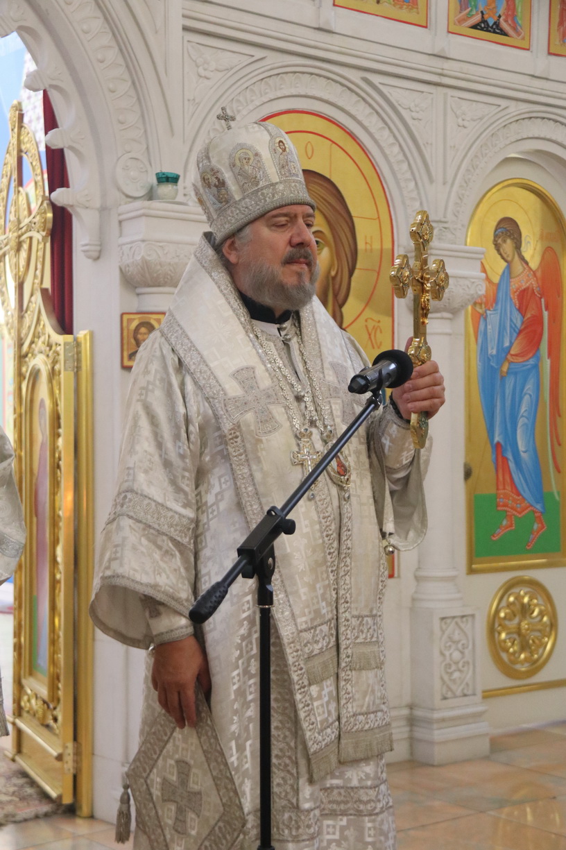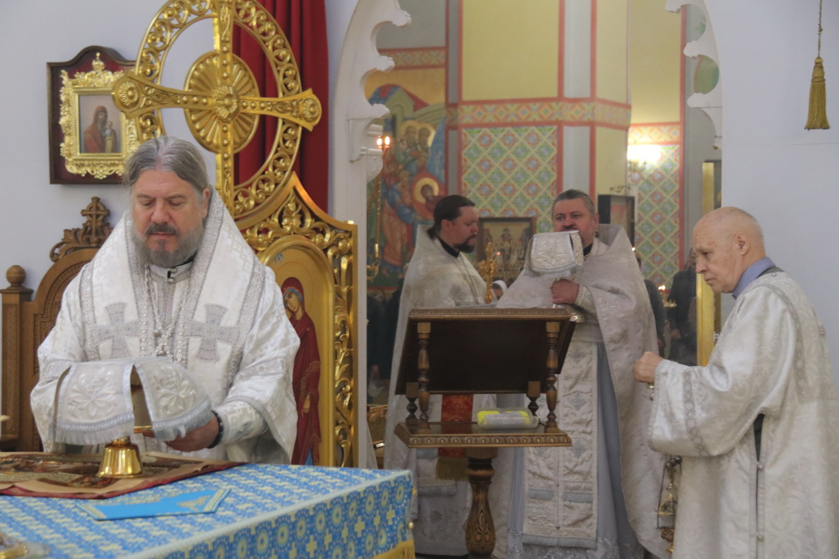 Его Преосвященству сослужили: иерей Виталий Шаркеев, руководитель Епархиального отдела по связями со СМИ; иерей Андрей Попов; иереи Иоанн и Илия Гречишниковы.