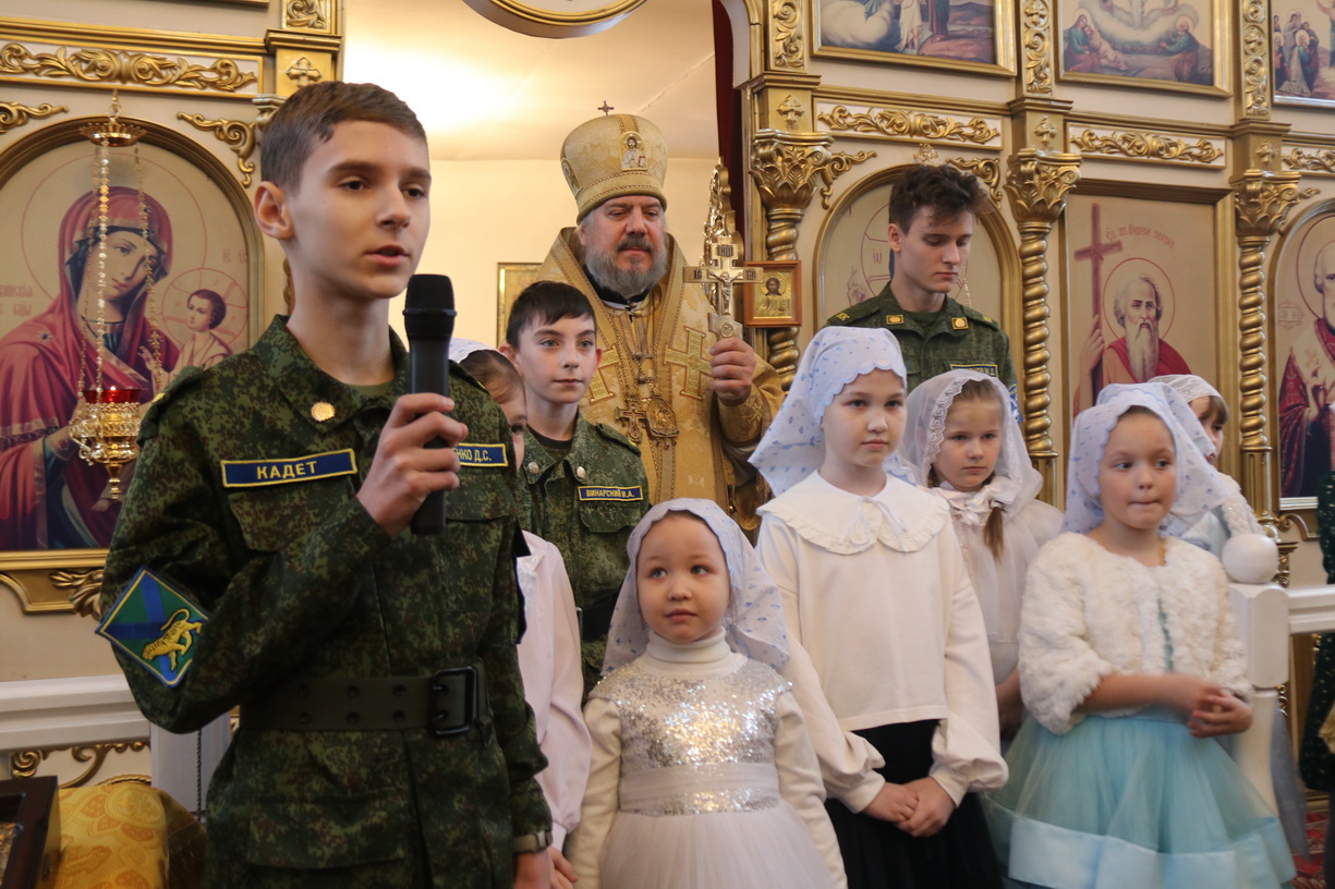 Со стихотворным поздравлением архипастырю, духовенству и всем прихожанам храма выступили воспитанники воскресной школы.