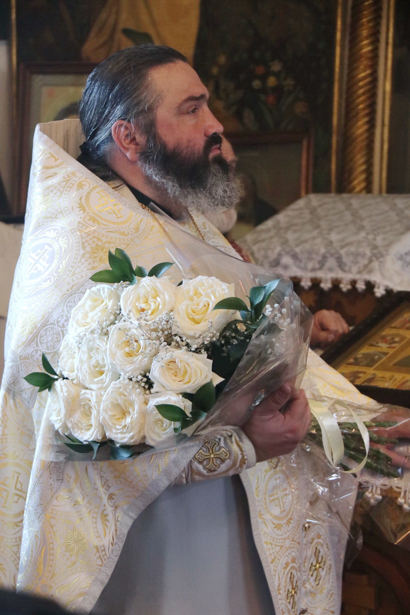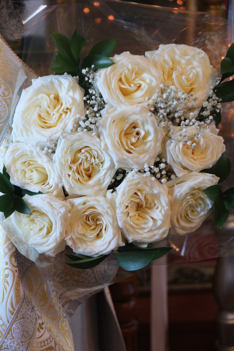 Также Владыка поздравил митрофорного протоиерея Василия Кабанова, настоятеля храма, с днем памяти его небесного покровителя святителя Василия Великого, архиепископа Кессарии Капподокийской и днем его 92-летия и преподнес ему букет белых роз.