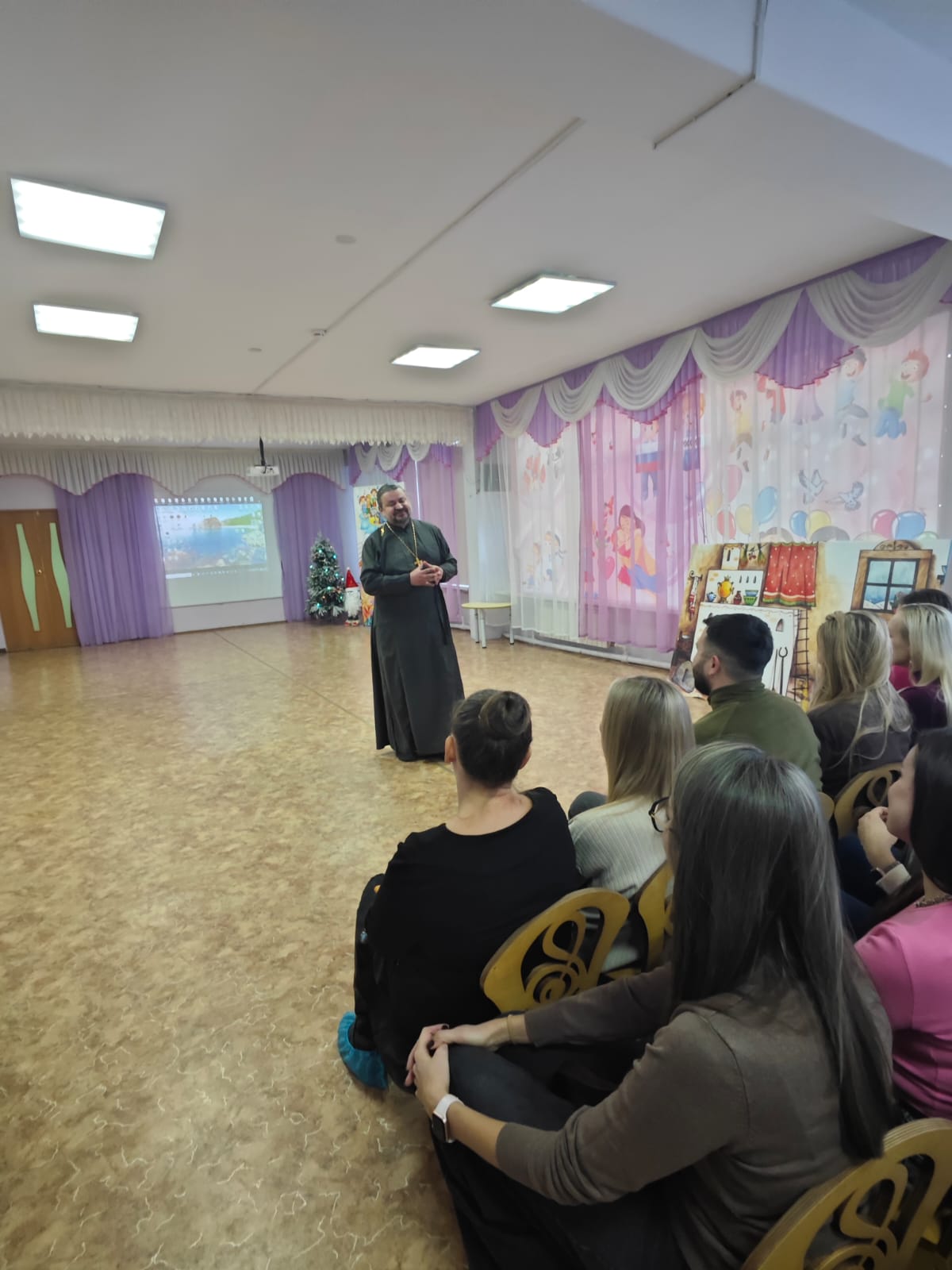 Иерей Виталий Шаркеев, руководитель миссионерского отдела Находкинской епархии, по приглашению администрации образовательного учреждения посетил детский сад №8 г. Находки и встретился с родителями дошкольников.