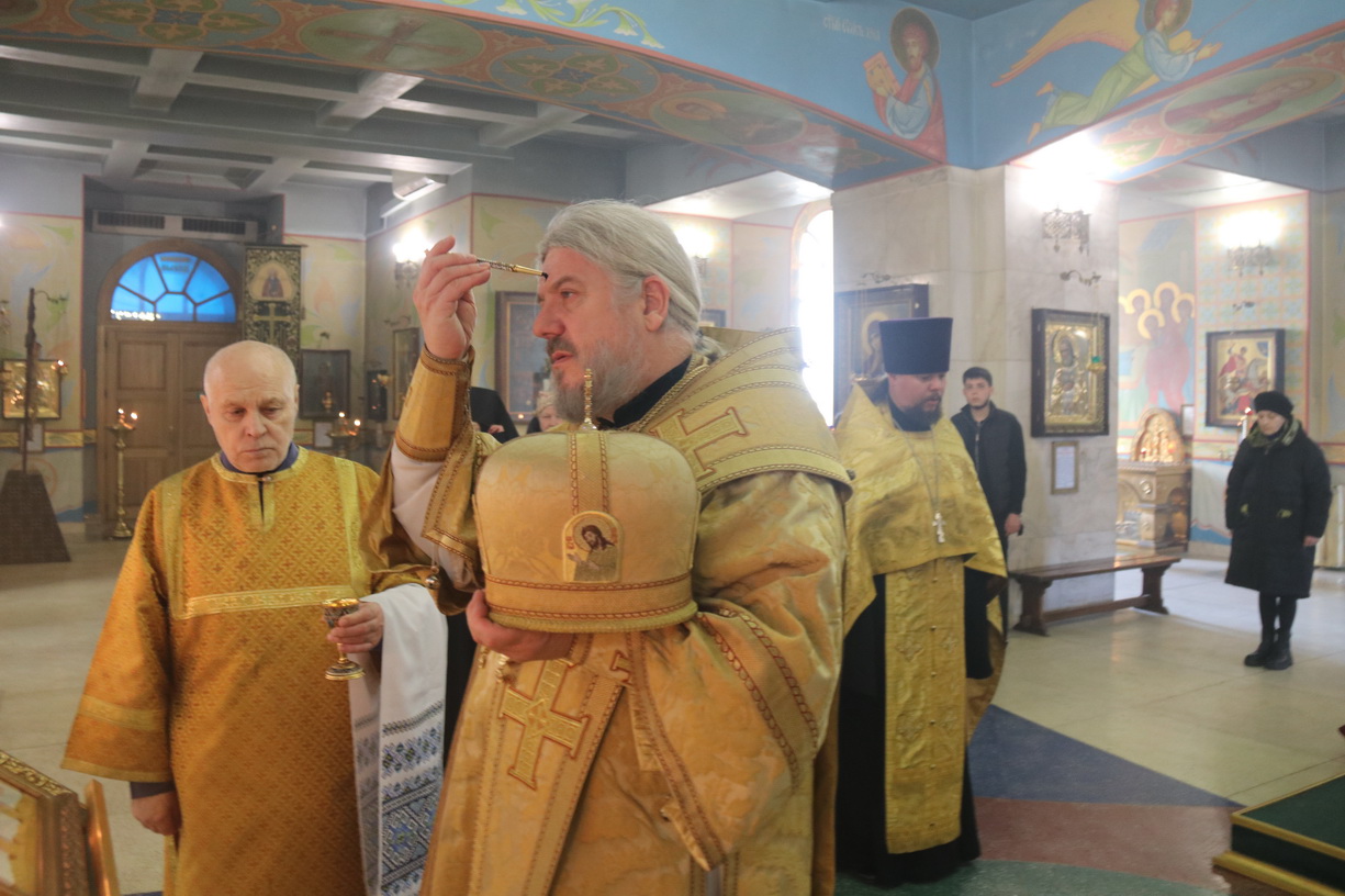 На утрене всенощного бдения после чтения уставного Евангельского зачала Владыка помазал духовенство и прихожан освященным елеем.