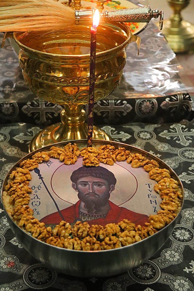 Житие святого великомученика Феодора Тирона: В городе Амасии, в Понтийской области, во время гонения императора Максимиана (286-305 гг.) воин Феодор (Федор) вместе с другими христианами был принуждаем отречься от Христа и принести жертву идолам. Оказавшись исполнить это, Феодор был подвергнут жестоким мучениям и заключен в темницу. Здесь во время молитвы он был утешен чудесным явлением Господа Иисуса Христа. Через некоторое временя мученика вывели из темницы и разными пытками снова принуждали отречься от Христа. Наконец, видя непреклонность мученика правитель приговорил его к сожжению. Святой Феодор сам бестрепетно взошел на костер, и здесь с молитвой и славословием предал свою душу Богу около 305 года.