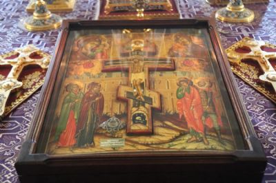 За всенощным бдением в центр храма торжественно был вынесена икона Распятия Христова с частицей Животворящего Креста Господня – напоминание о приближающейся Страстной Седмице и Пасхе Христовой.