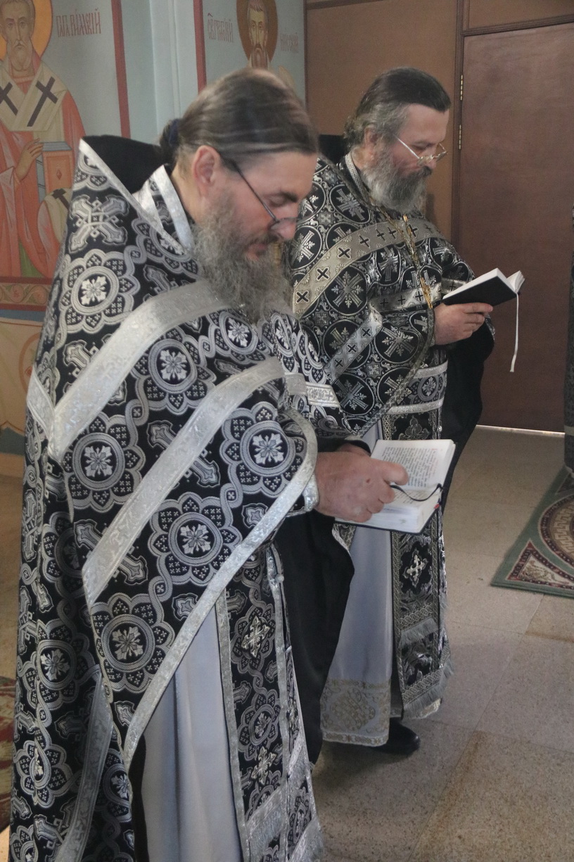 Его преосвященству сослужи: иерей Виталий Шаркеев; игумен Варнава (Литвин), настоятель храма Воскресения Христова с. Бровничи, иерей Сергий Вовк, клирик храма Рождества Божией Матери г. Паритизанска.