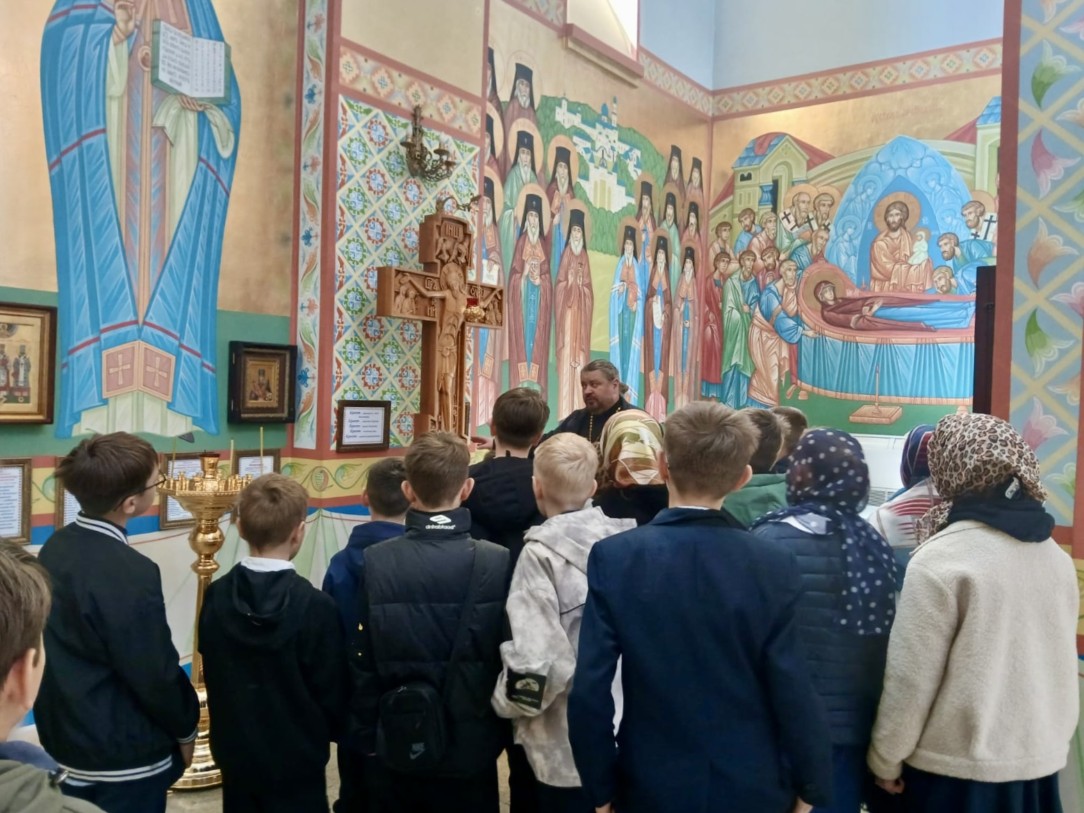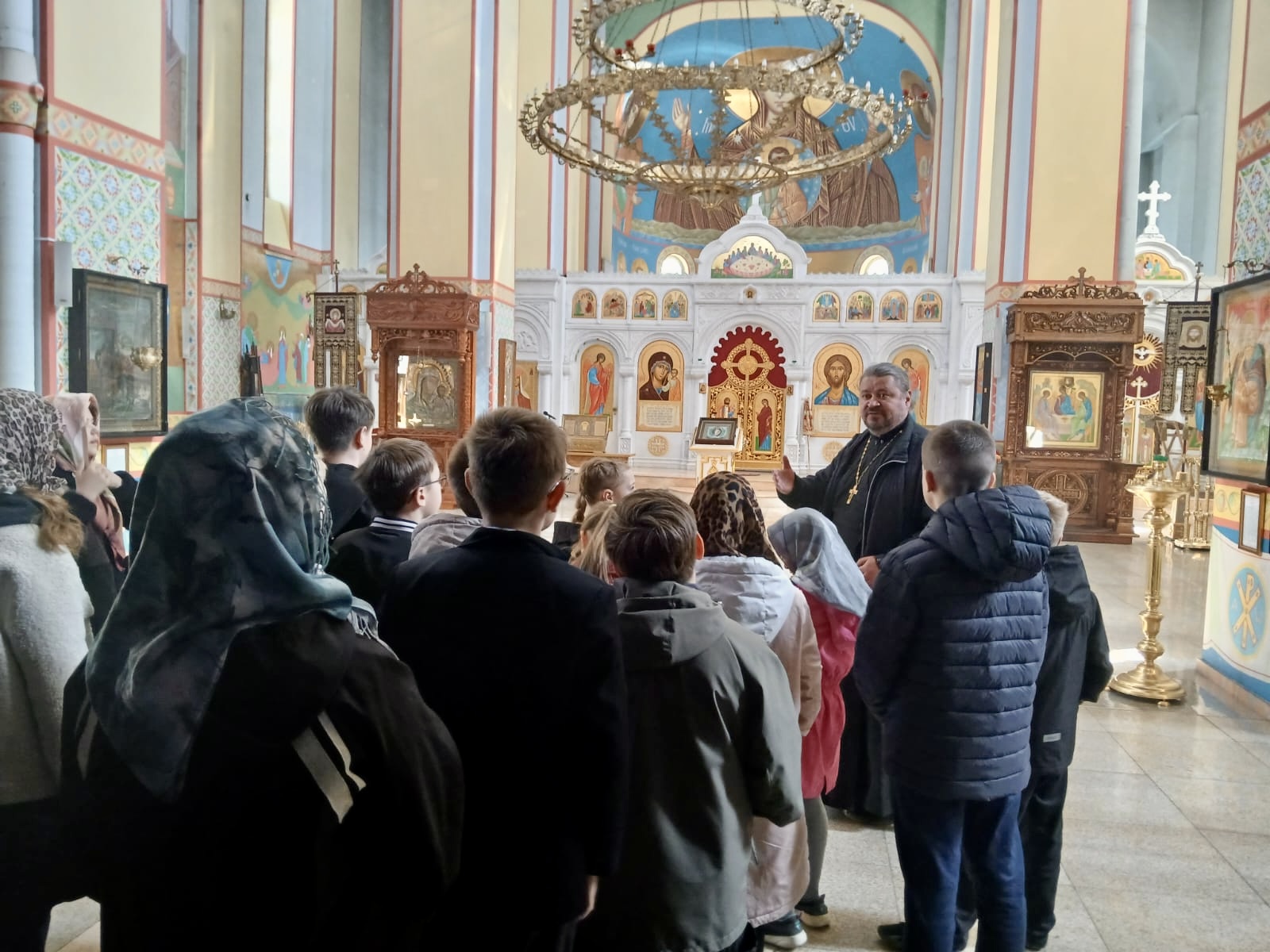 Священник проводит экскурсии для школьников в Казанский кафедральный собор.