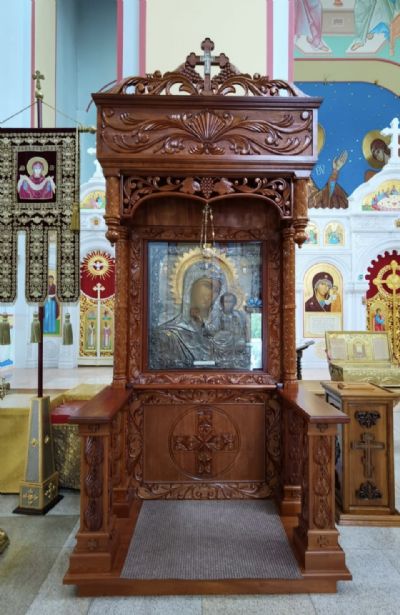 При входе в Храм сразу обращает на себя взор уникальная роспись в верхней части алтарной апсиды – Божья Матерь (Оранта "Молящаяся" с Младенцем) простирает руки над нашим городом Находкой, как бы покрывая его молитвенным жестом, и воспринимается как главное, доминирующее изображение во всем храме.