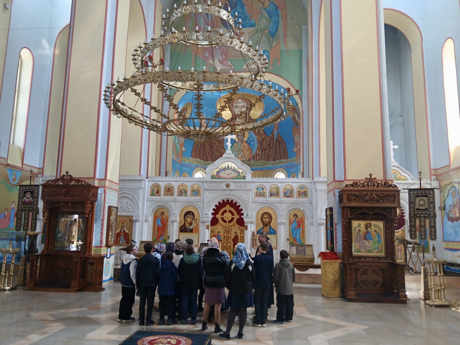 Отец Виталий рассказал ребятам, что Храм — это место, где совершаются богослужения, в том числе главное из них — Божественная литургия. Наш собор пятиглавый, самый большой купол символизирует Господа Иисуса Христа, остальные поменьше — четырех евангелистов. Высота собора 43.5 метра. Здание кафедрального собора выполнено в традициях владимирско-суздальской храмовой архитектуры, для которой характерны строгие формы с минимальным количеством декоративных деталей. В соборе два этажа и два храма. В летнее время после Пасхи экскурсии проводятся в верхнем храме.