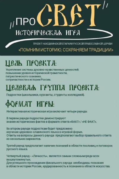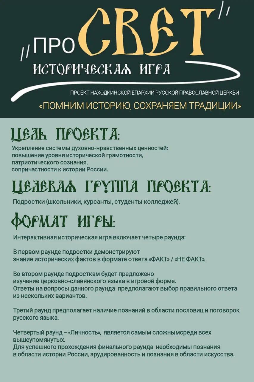 17 мая 2026 года в Духовно-просветительском центре Находкинской епархии состоится интерактивная историческая игра для молодежи «Про Свет» в рамках проекта «Помним историю, сохраняем традиции» при поддержке Гранта Губернатора Приморья.