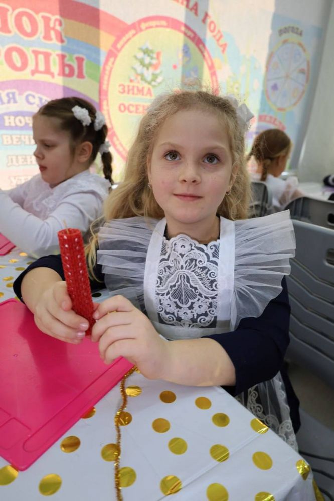 Отец Александр объяснил ребятам, кто такие святые, и рассказал краткое житие Николая Угодника. После ребята прочитали заготовленные стихи, исполнили песни, поиграли в игры «Свет добрых дел» и «Сундук доброты», а также поучаствовали в викторине по мотивам жития свт. Николая Чудотворца. Затем школьники под руководством взрослых сделали свечи, которые потом подарили родителям и близким.