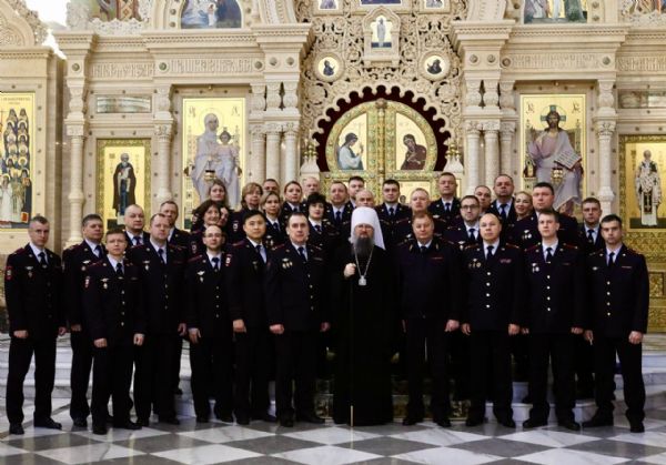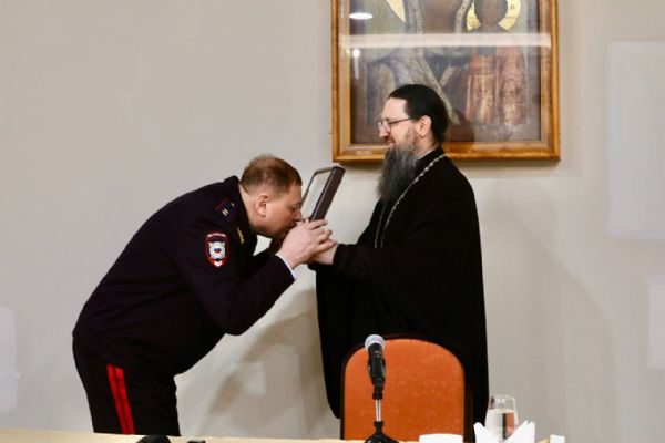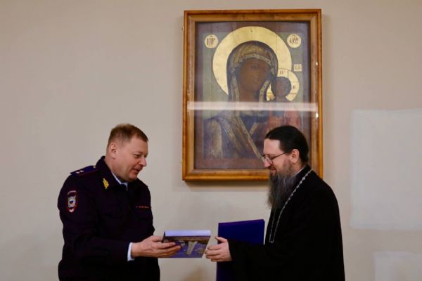 В завершение встречи правящий архиерей выразил признательность полицейским за их самоотверженную службу и рассказал о двух подвигах сотрудников МВД, которые отдали свои жизни, защищая мирных граждан нашей страны. Глава митрополии преподнес Александру Викторовичу в дар Порт-Артурскую икону Божией Матери.