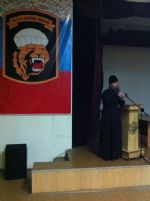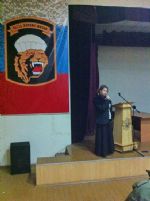 Уссурийск. С солдатами и офицерами 83-й отдельной десантно-штурмовой бригады встретились протоиерей Александр Талько, руководитель Общества православных врачей, иерей Сергий Качев, клирик Покровского храма г Уссурийска, зам.руководителя отдела по работе с казачеством и клинический психолог Центра защиты материнства «Колыбель» Елена Владимировна Волошина. На мероприятии присутствовало около 300 солдат и офицеров.