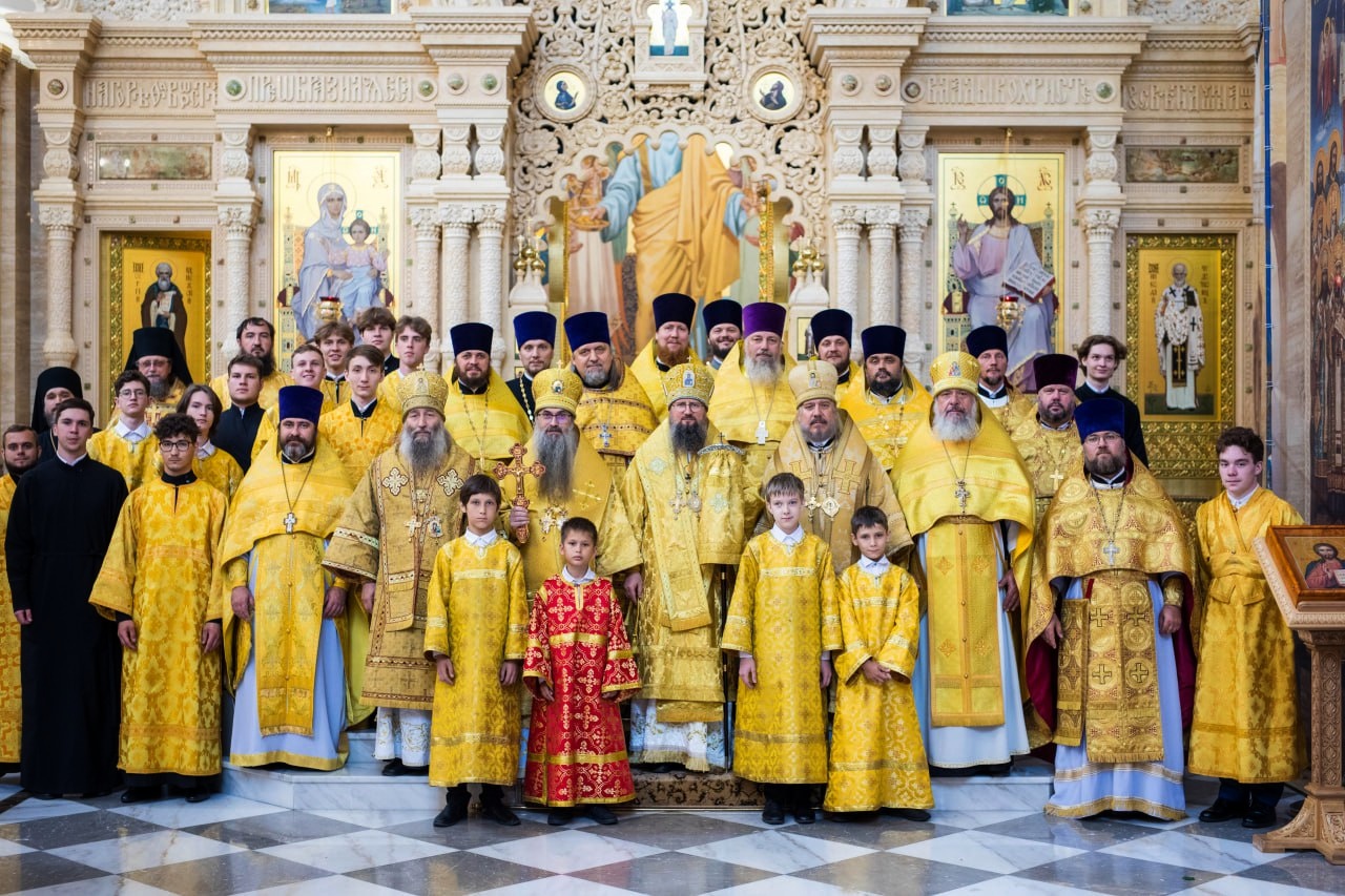 Его Высокопреосвященству сослужили наместник монастыря игумен Климент (Кривоносов), благочинный монастыря иеромонах Серафим (Добрицкий), иеромонах Марк (Корнилов), настоятель Петропавловского храма п. Трудовое иеромонах Кирилл (Корниенко).