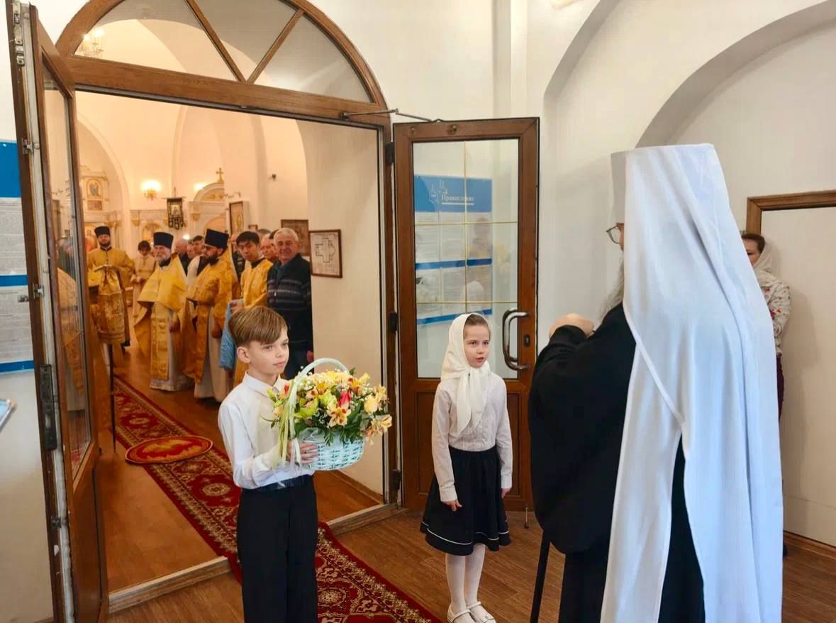 На входе в храм главу митрополии встретили юные прихожане с букетом цветов.