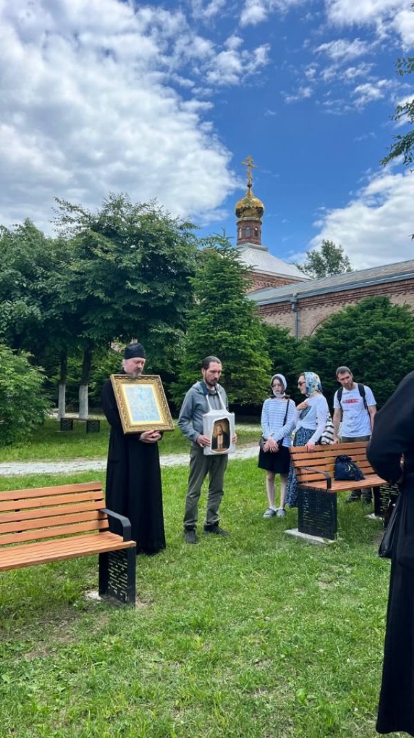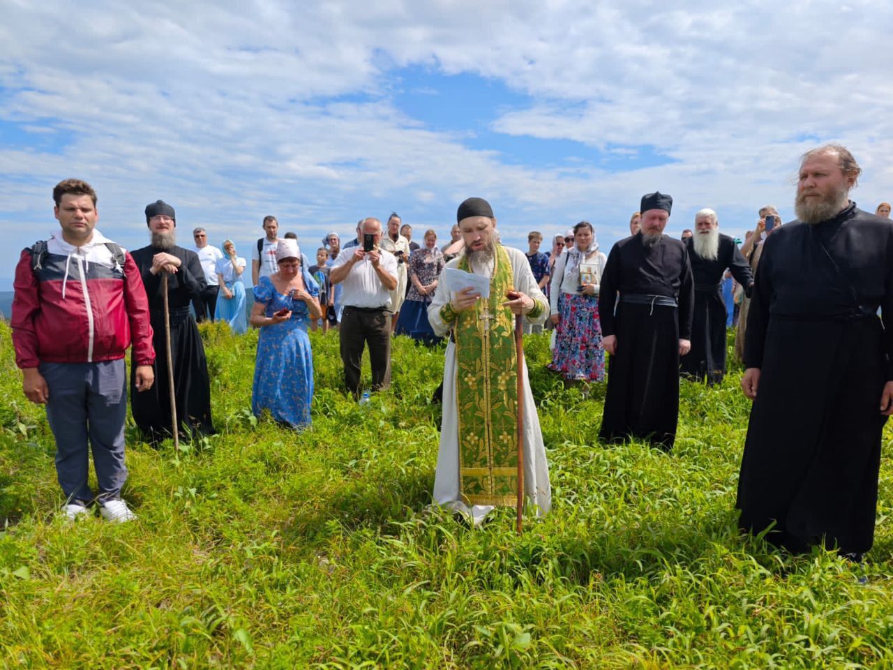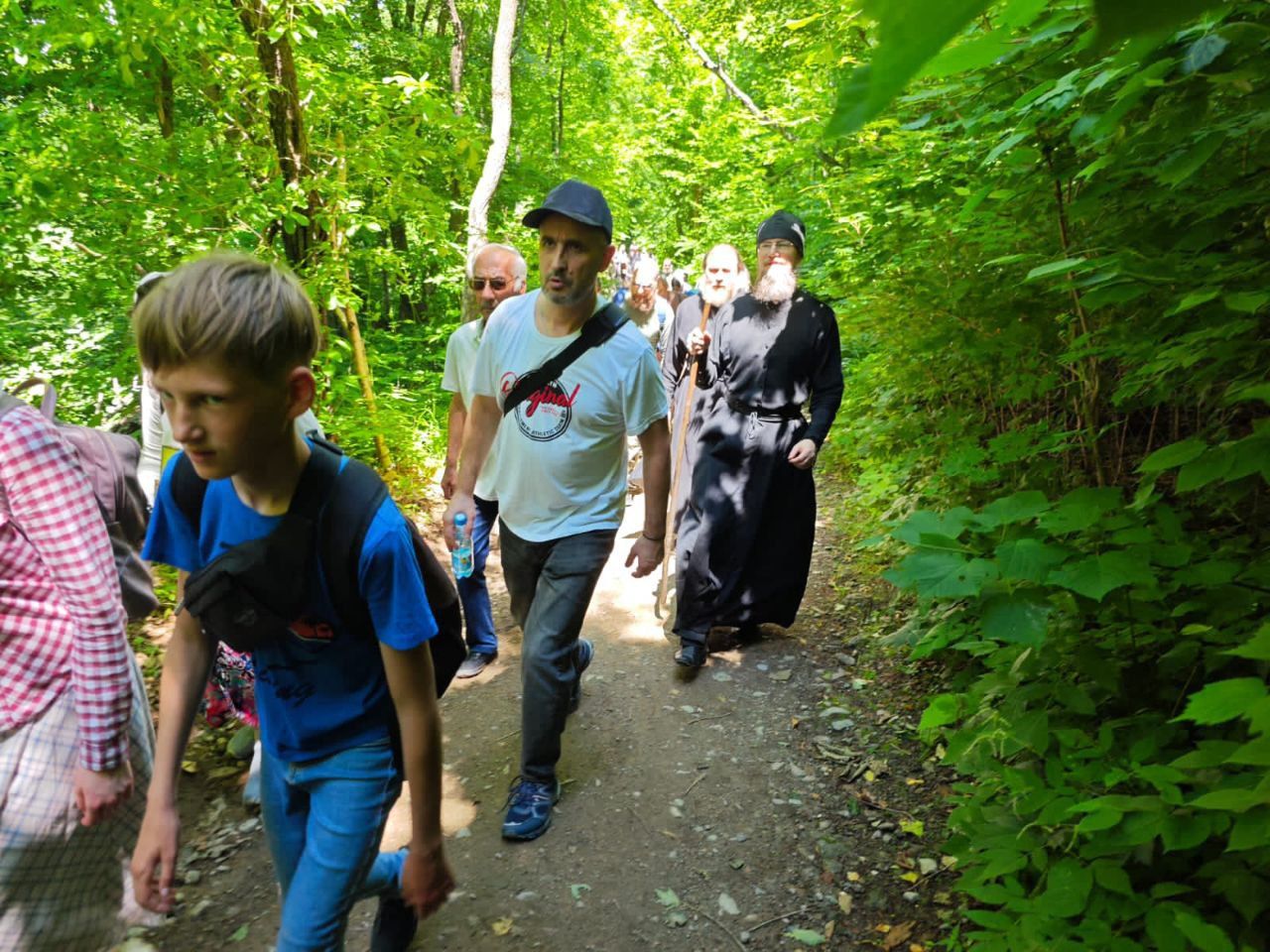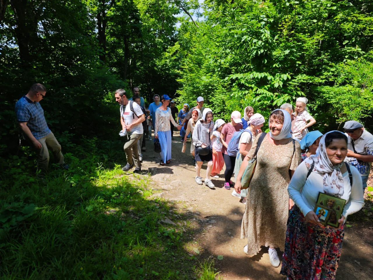 В 14 часов участники крестного хода собрались возле монастырского храма. Игумен Климент (Кривоносов) и иеромонах Серафим (Добритский), благочинные монастыря, насельники, паломники и прихожане обители совершили перед монастырским храмом молебен всем русским святым и выдвинулись по лесной дороге на Гору русских.