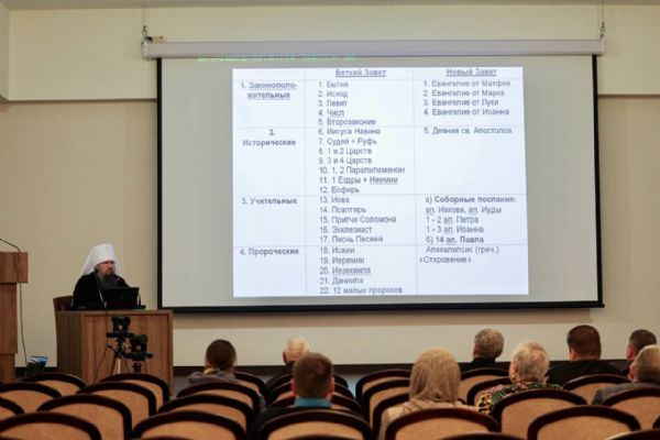Архипастырь рассказал присутствующим о книгах, входящих в Ветхий и Новый Завет. Владыка Павел поведал о жизни первых людей в Раю и последующем грехопадении. Морские офицеры узнали о пришествии Иисуса Христа на землю и Его спасительной жертве во имя любви к человечеству. Также глава митрополии кратко рассказал о других религиях.
