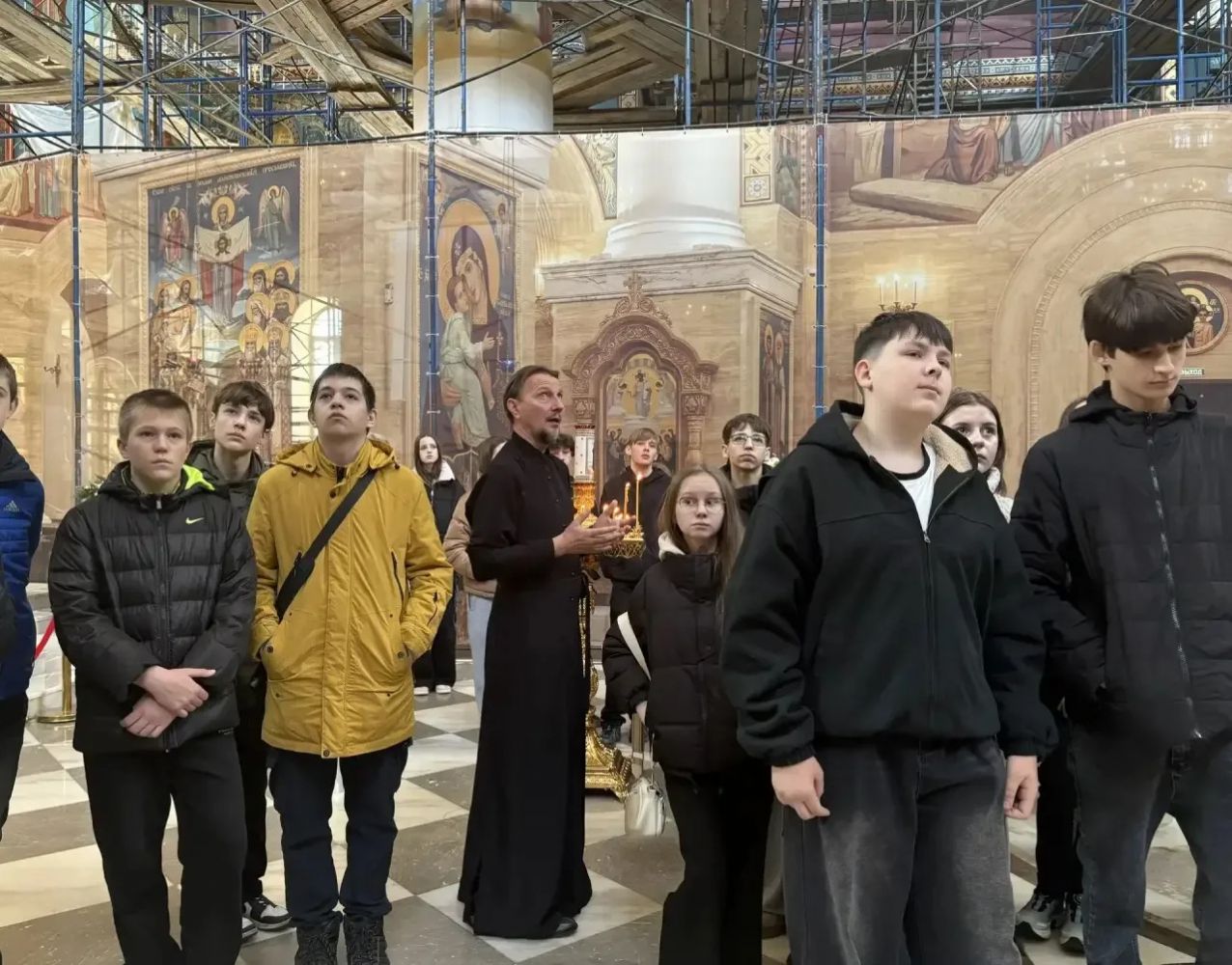 Для учащихся была организована экскурсия по главному храму Приморья, которую провели иерей Александр Соколов и иерей Димитрий Винокуров. Батюшки рассказали ребятам о воскресении Лазаря, празднике Входа Господня в Иерусалим, и о том, как вера способна менять жизнь человека на примере св. равноапостольного князя Владимира.