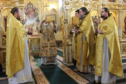 За Божественной литургией Его Высокопреосвященству сослужили ключарь собора протоиерей Александр Талько, благочинный I округа иерей Димитрий Федорин и клирики собора.
