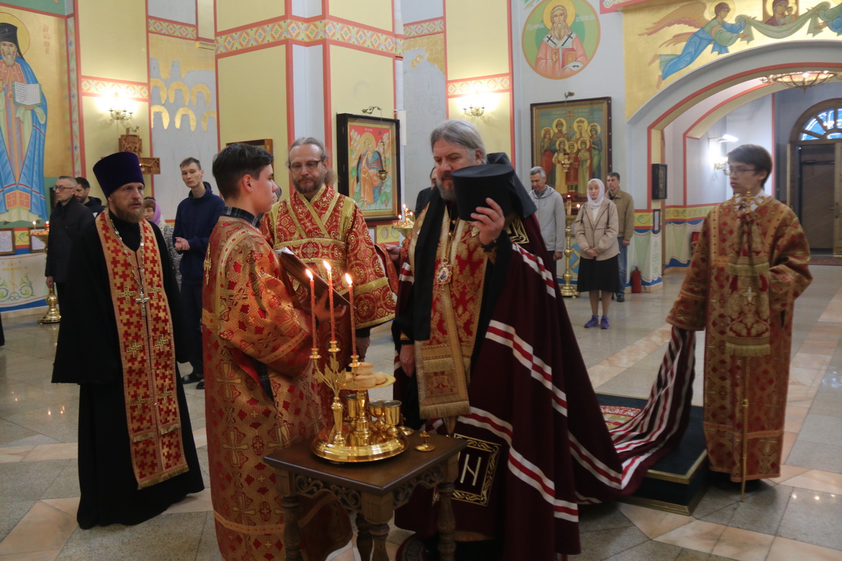 Его Преосвященству сослужили: иерей Андрей Калнин;иерей Виталий Шаркеев; иерей Андрей Попов.