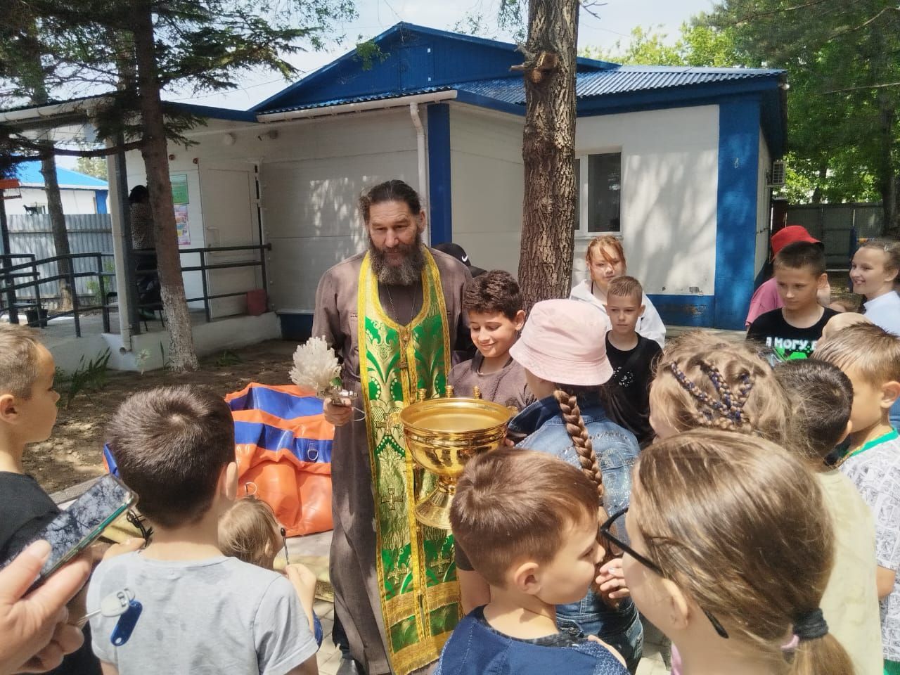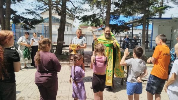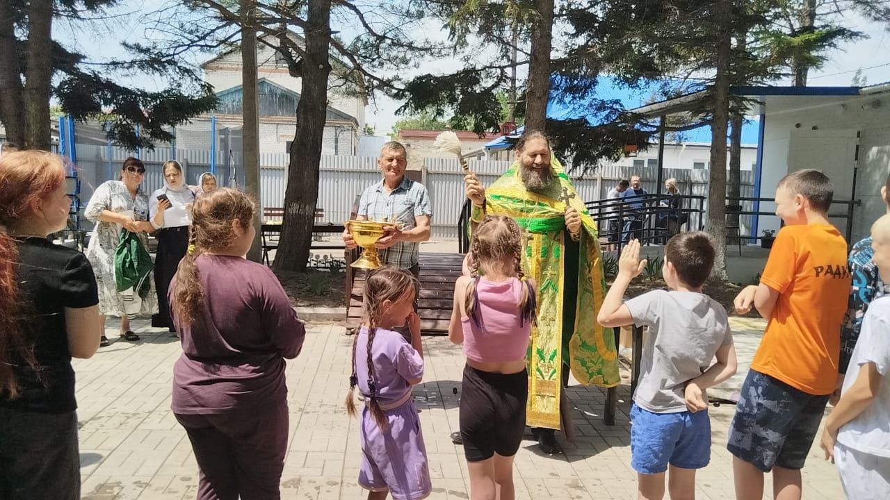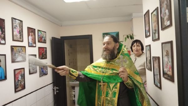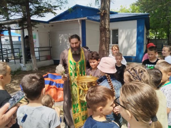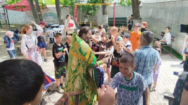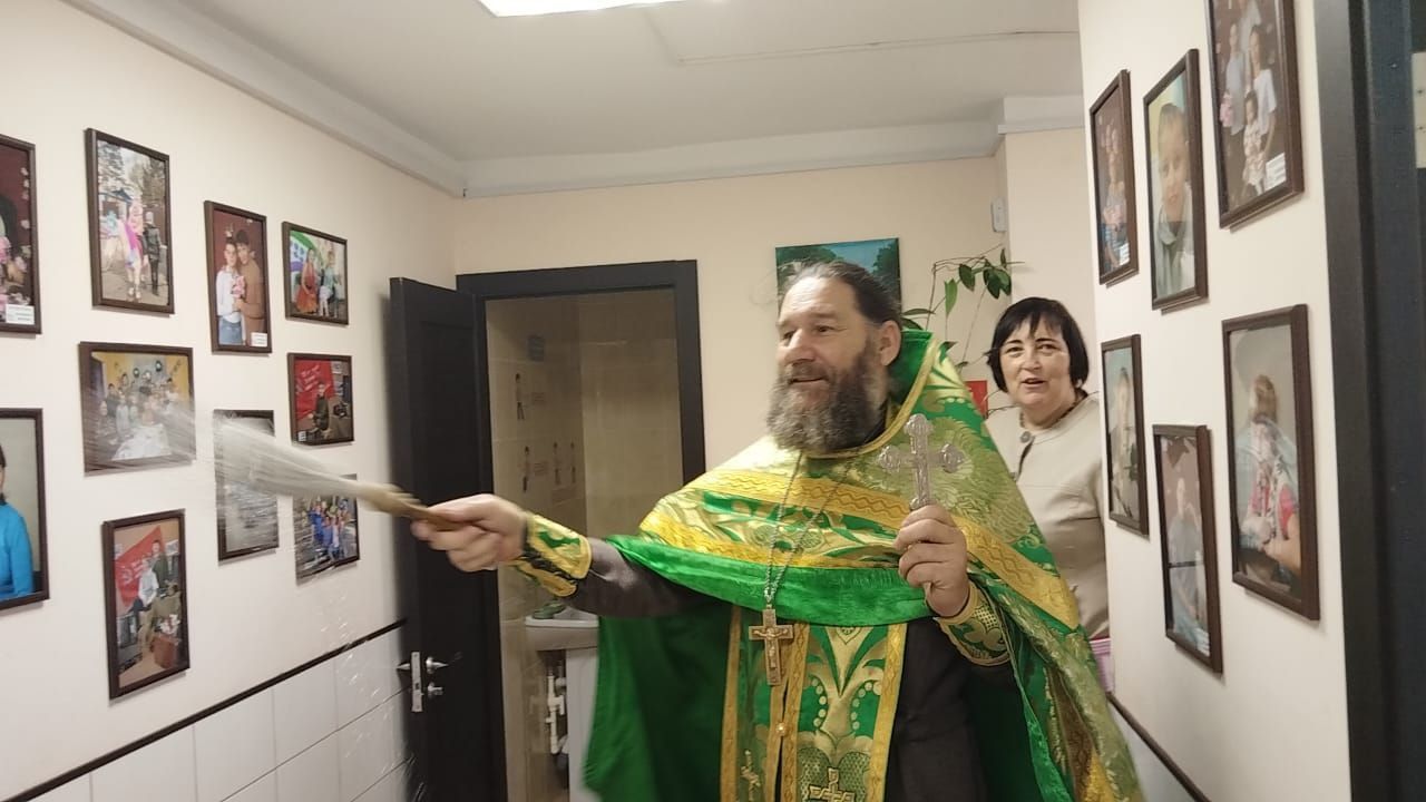 Там их с радостью ожидали маленькие прихожане. Отец Владимир отслужил водосвятный молебен, после которого окропил святой водой всех участвующих в этом Троицком торжестве. Также настоятель освятил спортивный зал и два учебных класса.