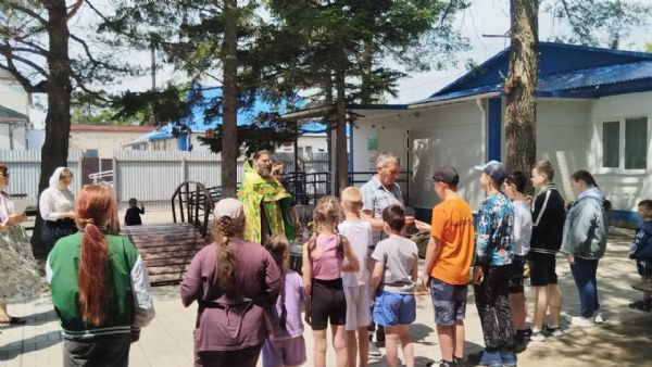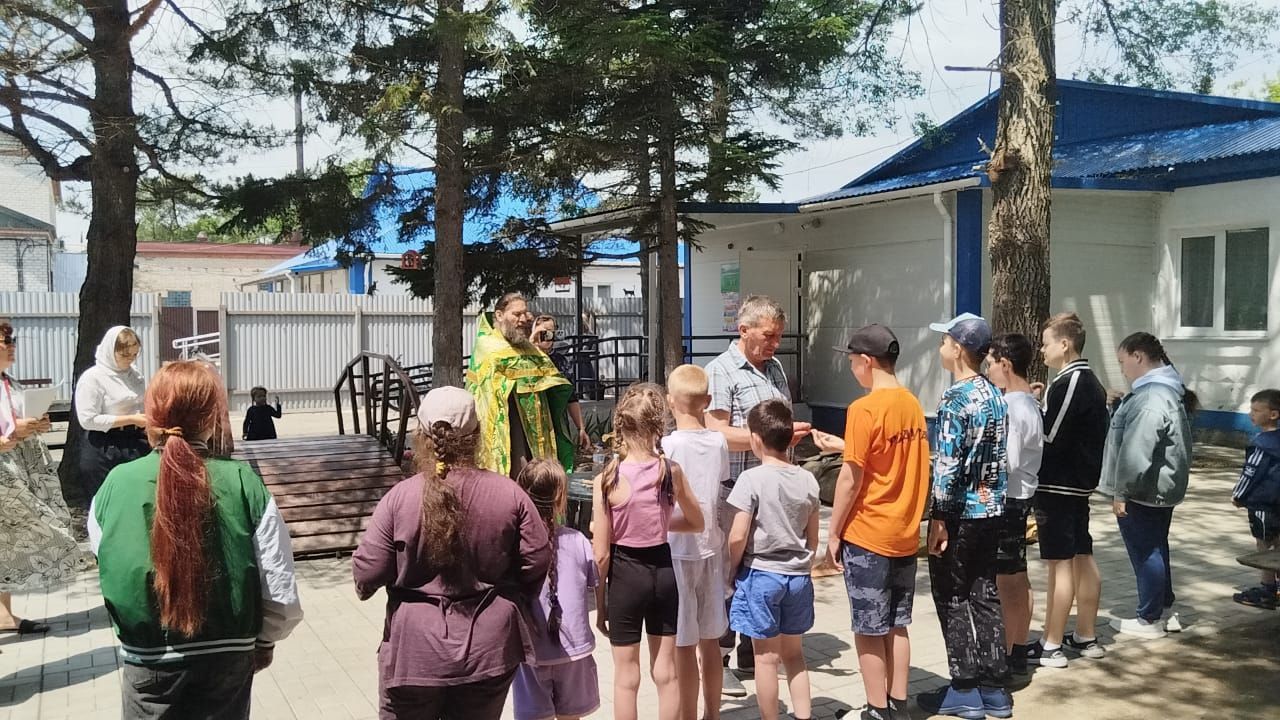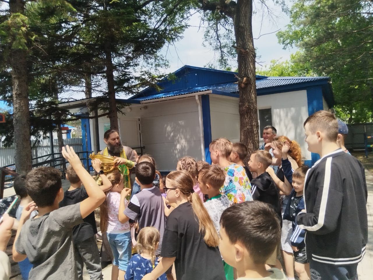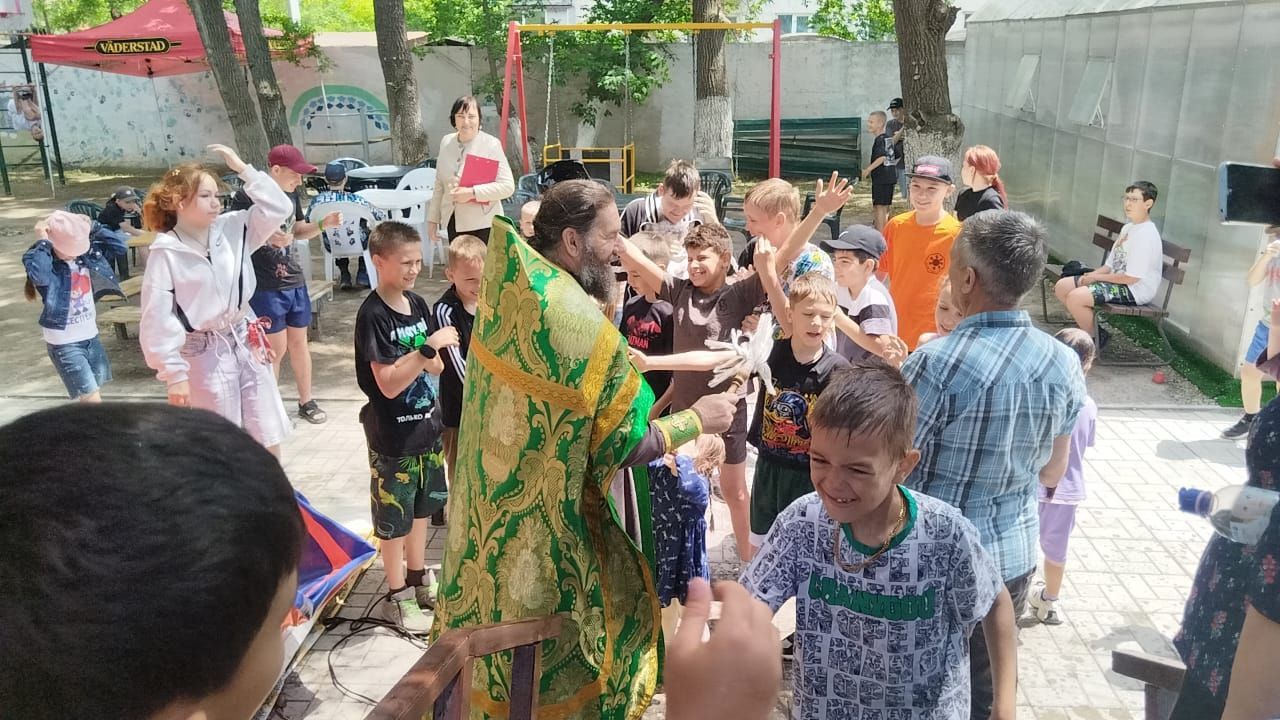 Там их с радостью ожидали маленькие прихожане. Отец Владимир отслужил водосвятный молебен, после которого окропил святой водой всех участвующих в этом Троицком торжестве. Также настоятель освятил спортивный зал и два учебных класса.