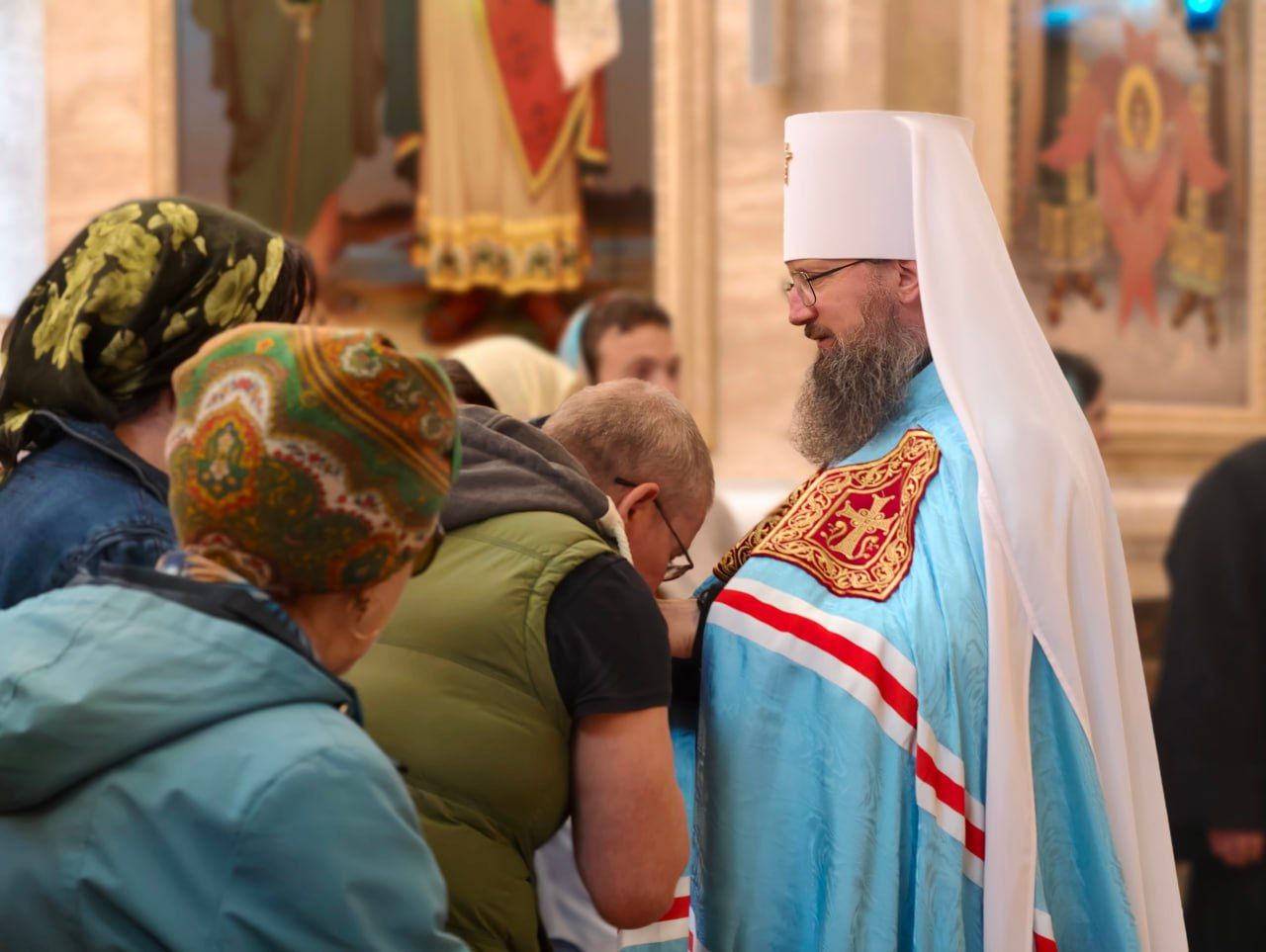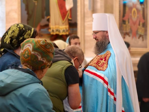 В начале канона правящий архиерей совершил помазание молящихся освященным елеем, символизирующим благодать и милость Божию ко всем, с верой притекающим.