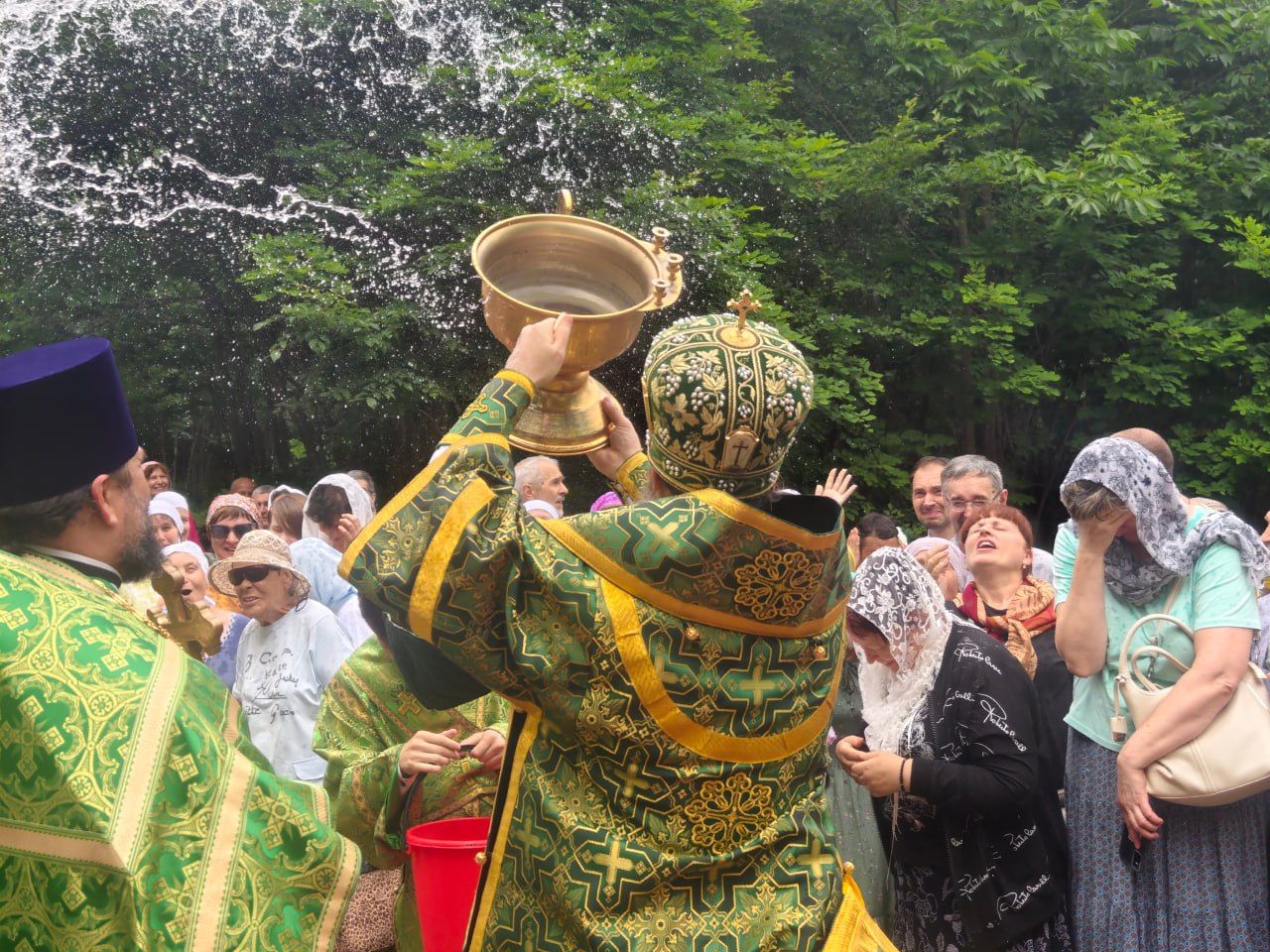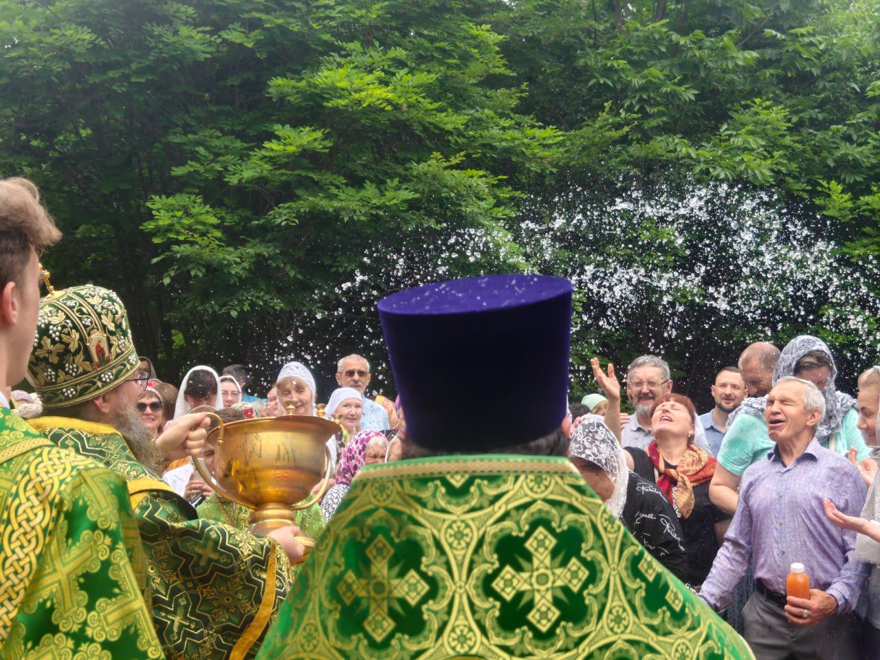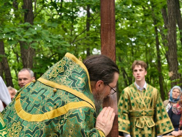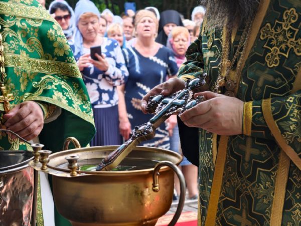 По окончании Литургии архипастырь, духовенство и миряне совершили молитвенное шествие к святому источнику Тихона Калужского. Здесь владыка Павел совершил водосвятный молебен, и по устоявшейся традиции, щедро окроплял верующих святой водой. Некоторым посчастливилось принять освящение целым потоком.