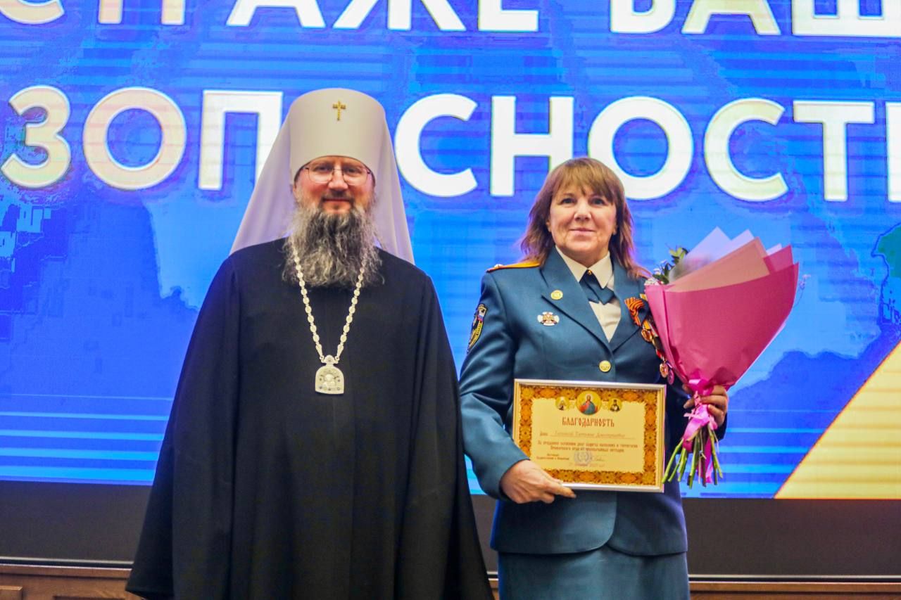 Архипастырь пожелал специалистам по чрезвычайным ситуациям Божией помощи в их тяжелой, но столь благой службе. Затем владыка наградил архиерейской грамотой генерал-лейтенанта Романа Чурсина, а также вручил благодарности ветерану МЧС России Татьяне Газиной, полковнику внутренней службы Роману Иванову, подполковнику внутренней службы Ольге Лавровой и спасателю поисково-спасательного отряда г. Владивостока Анатолию Морозову.