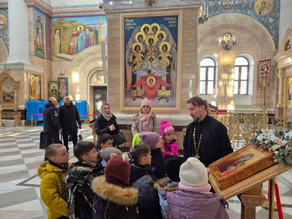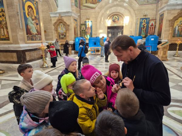 Для большинства детей это было первое посещение дома Божьего. Отец Димитрий рассказал ребятам об устройстве храма и алтаря. Особый интерес у школьников вызвал рассказ о храмовых иконах.