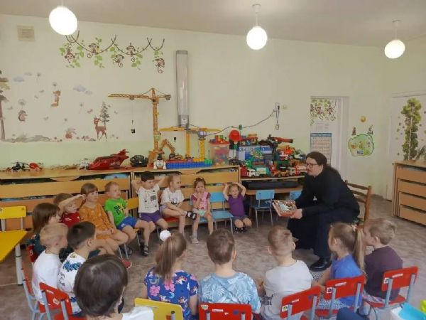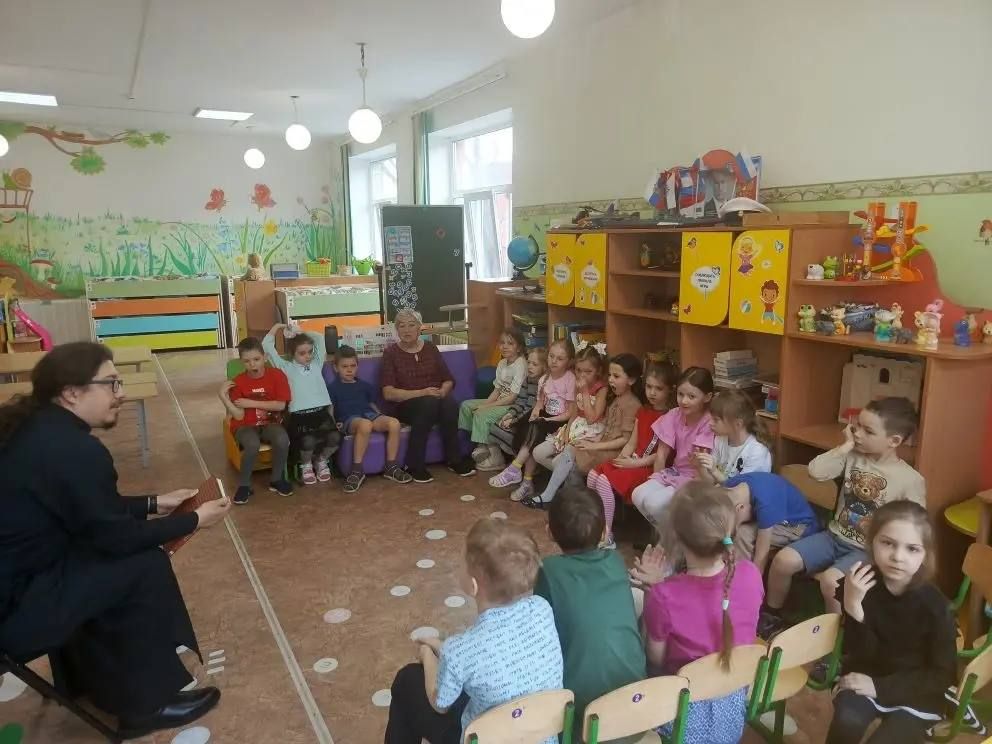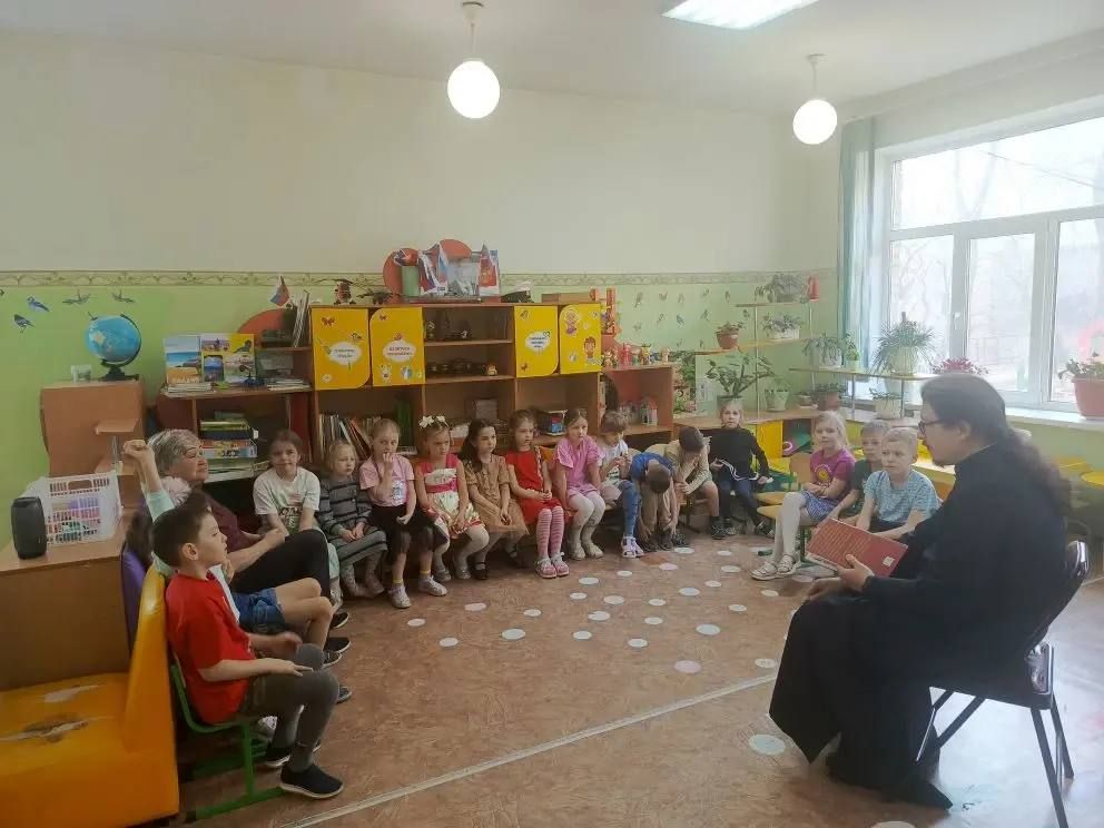 Священнослужитель рассказал детям о том, что первой печатной книгой на Руси стало Священное Писание, и познакомил их с детской Библией. На примере истории о сотворении мира и изгнании прародителей из рая отец Валентин объяснил малышам важность послушания.