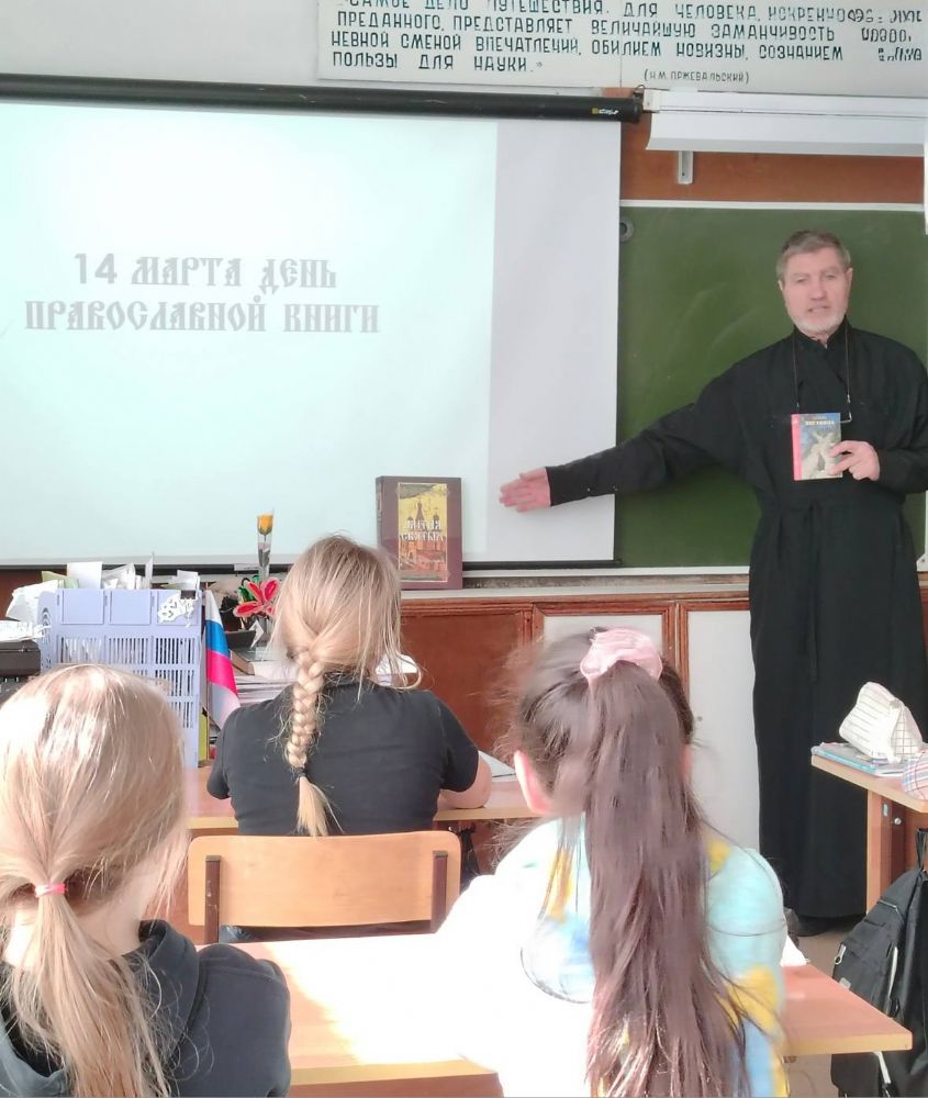 Гостем урока стал клирик храма Святого преподобного Алексия Человека Божия с. Камень-Рыболов диакон Виктор Воробьёв. Он рассказал школьникам о том, что такое православная книга, какое значение она имеет для каждого христианина и чем отличается от обычной художественной литературы. Особое внимание было уделено духовному содержанию и воспитательной роли православной литературы.