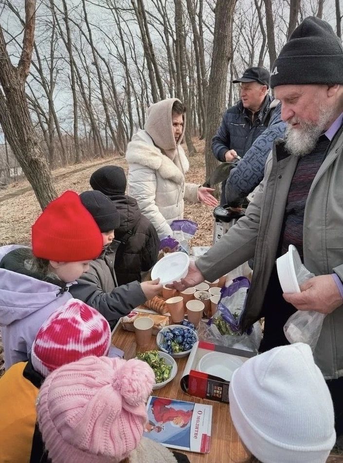 По традиции праздник прошёл на свежем воздухе — на поляне у склона сопки. Вместе с сёстрами милосердия и волонтёрами к детям также приехал клирик Успенского храма иерей Павел Иванчин.