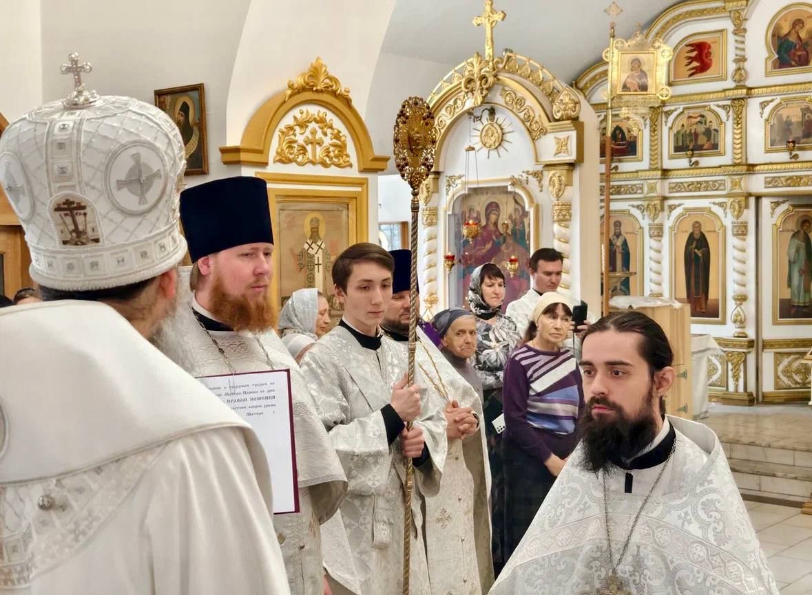 За богослужением протоиерей Андрей Калчев был награжден крестом с украшениями. Также владыка наградил иерея Владимира Корнева правом ношения камилавки.