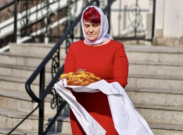 На входе в храм архипастыря гостеприимно хлебом-солью встретили прихожане.