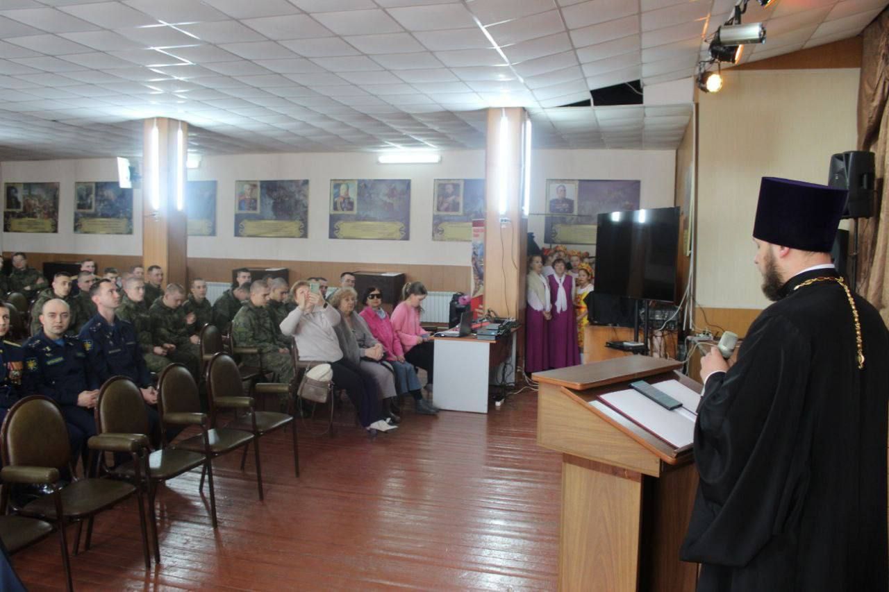 Отец Дионисий провел с личным составом просветительскую беседу, поздравил воинов с праздником и совершил благодарственный молебен. Завершилась встреча праздничным концертом, подготовленным творческими коллективами в Доме культуры военной части.