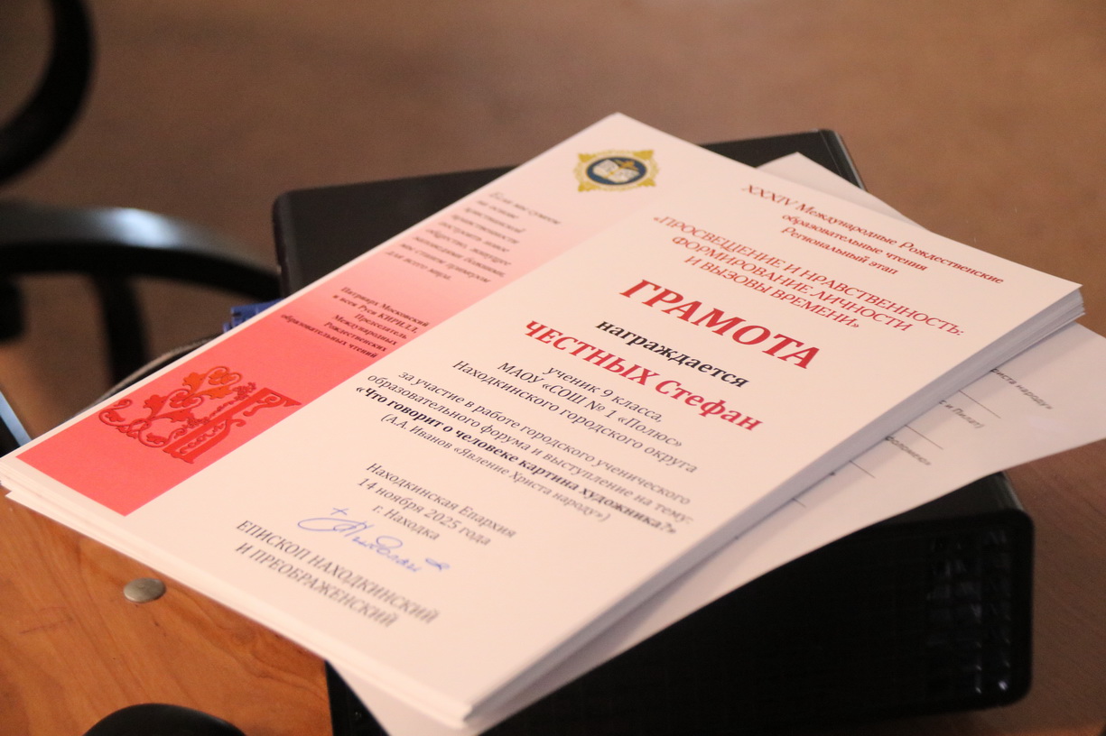 В заключение иерей Роман Капитанюк, руководитель отдела образования и катехизации Находкинской епархии, подвел итог форума и поблагодарил ребят за участие в мероприятии. Учителя были награждены благодарственными письмами, школьники - грамотами и сладкими подарками.